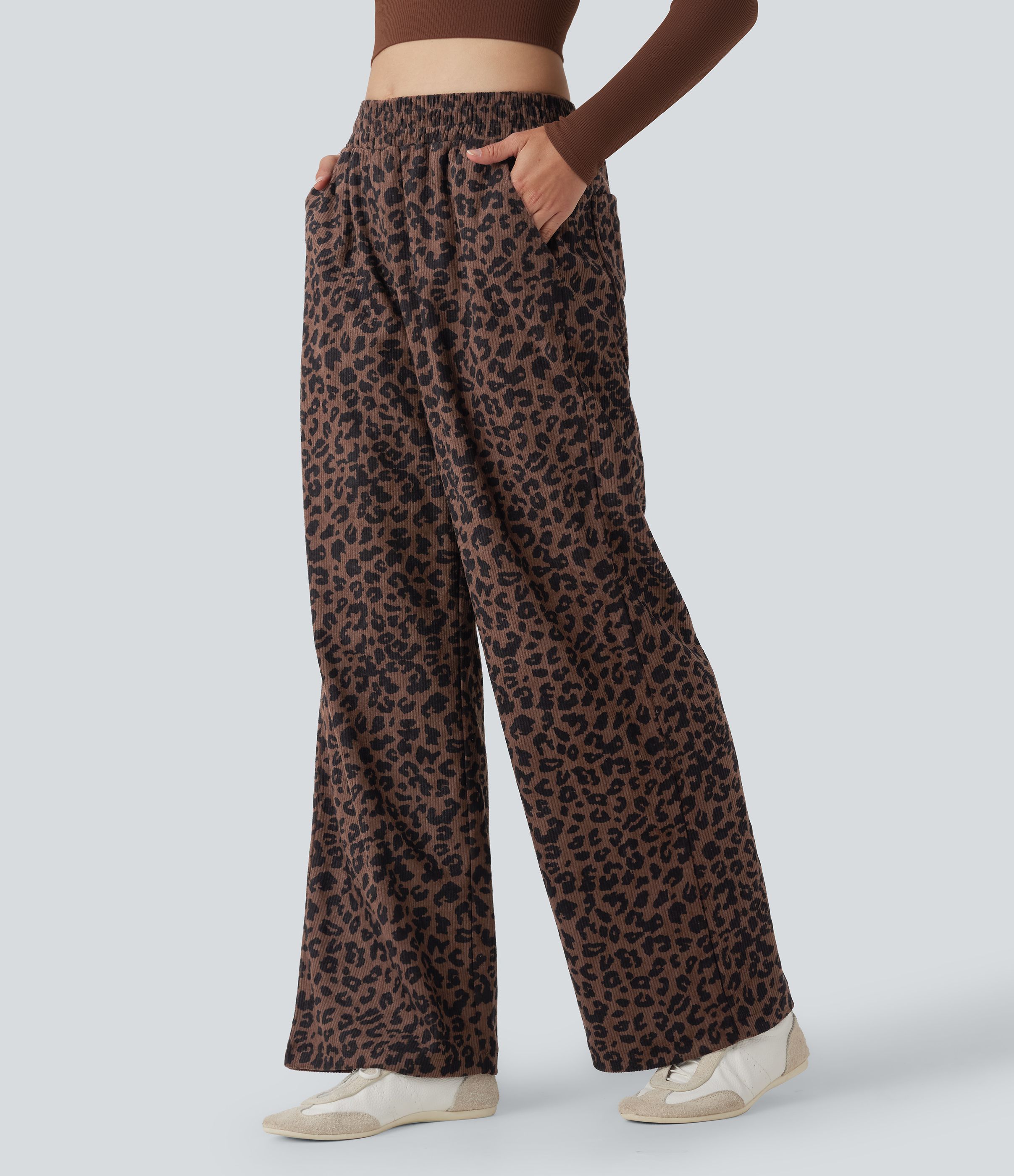High Waisted Leopard Print Corduroy Casual Baggy Pants with Pockets