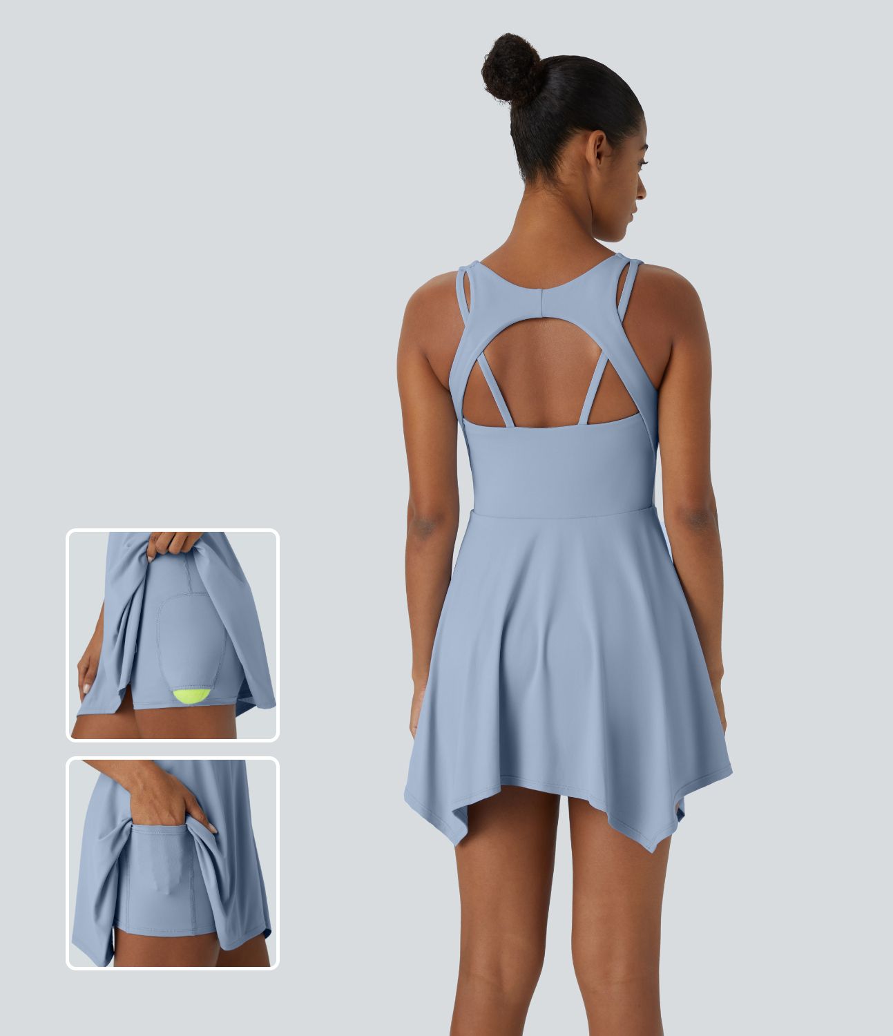 V Neck Backless 2-in-1 Side Pocket Flowy Mini Tennis Active Dress