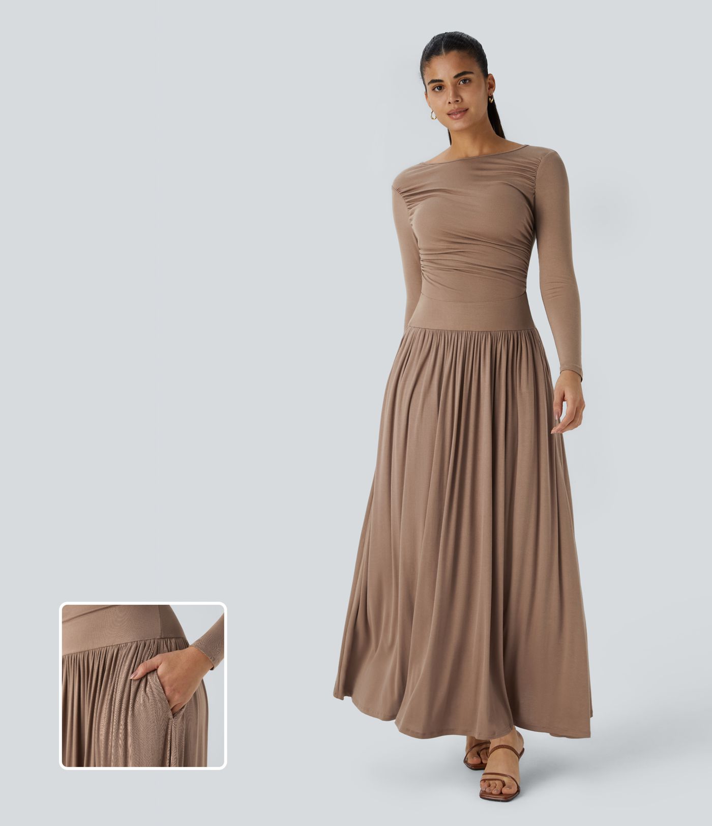 Ribbed Boat Neck Long Sleeve Ruched Side Pocket Flowy Maxi Casual Dress