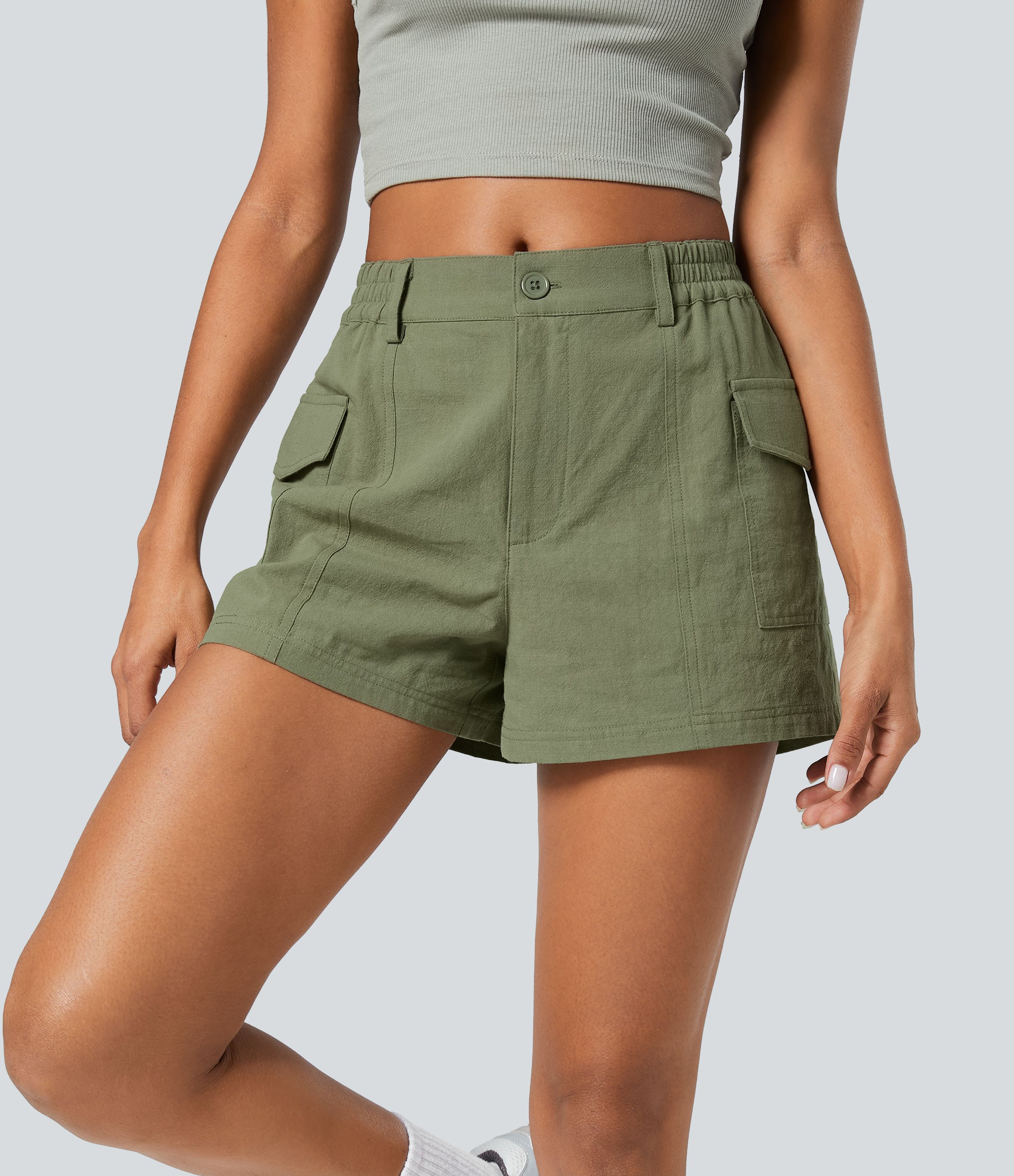 Mid Rise Button Zipper Side Flap Pocket Work Linen-Feel Shorts