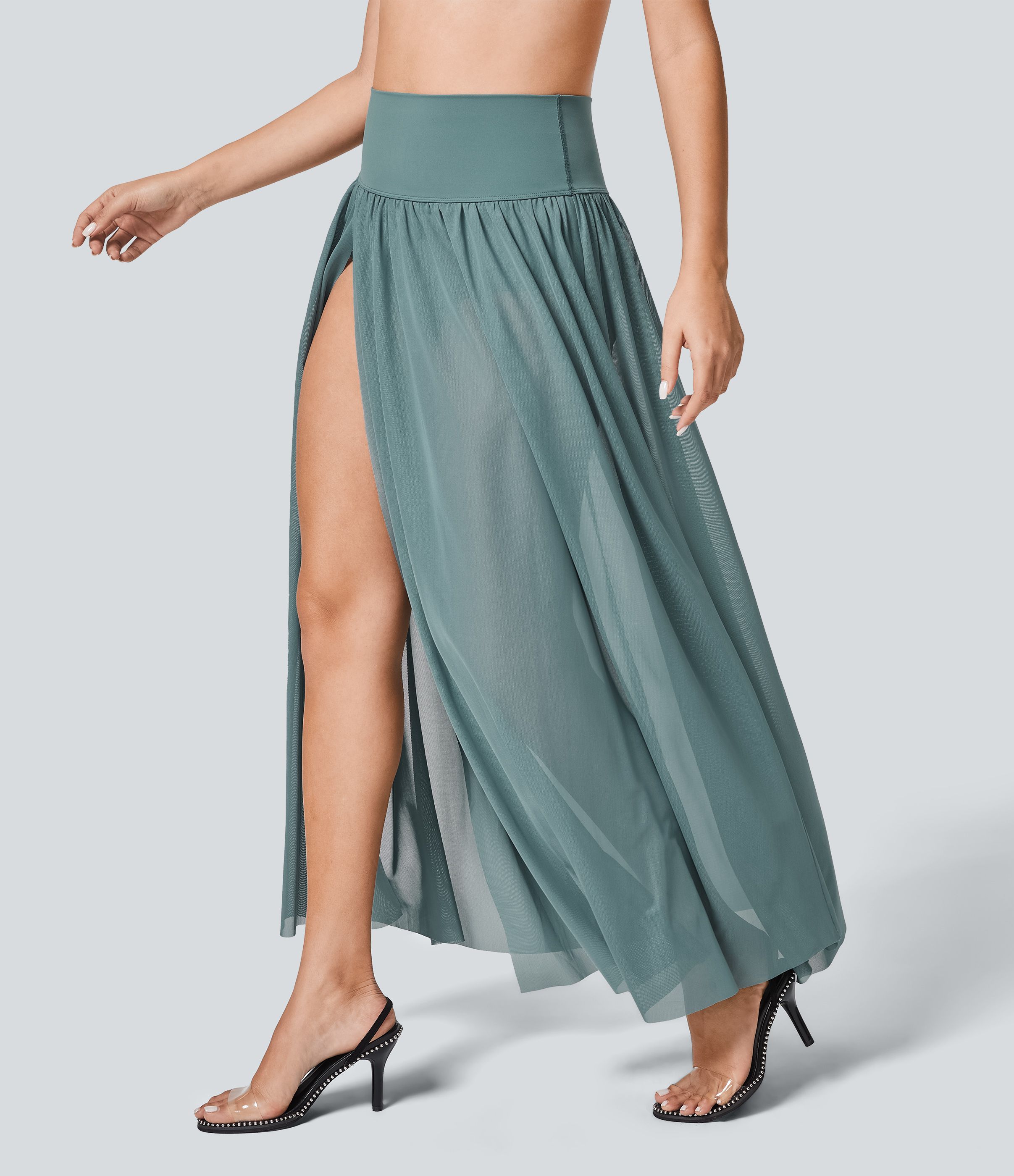 High Waisted Split 2-in-1 Mesh Flowy Maxi Casual Skirt