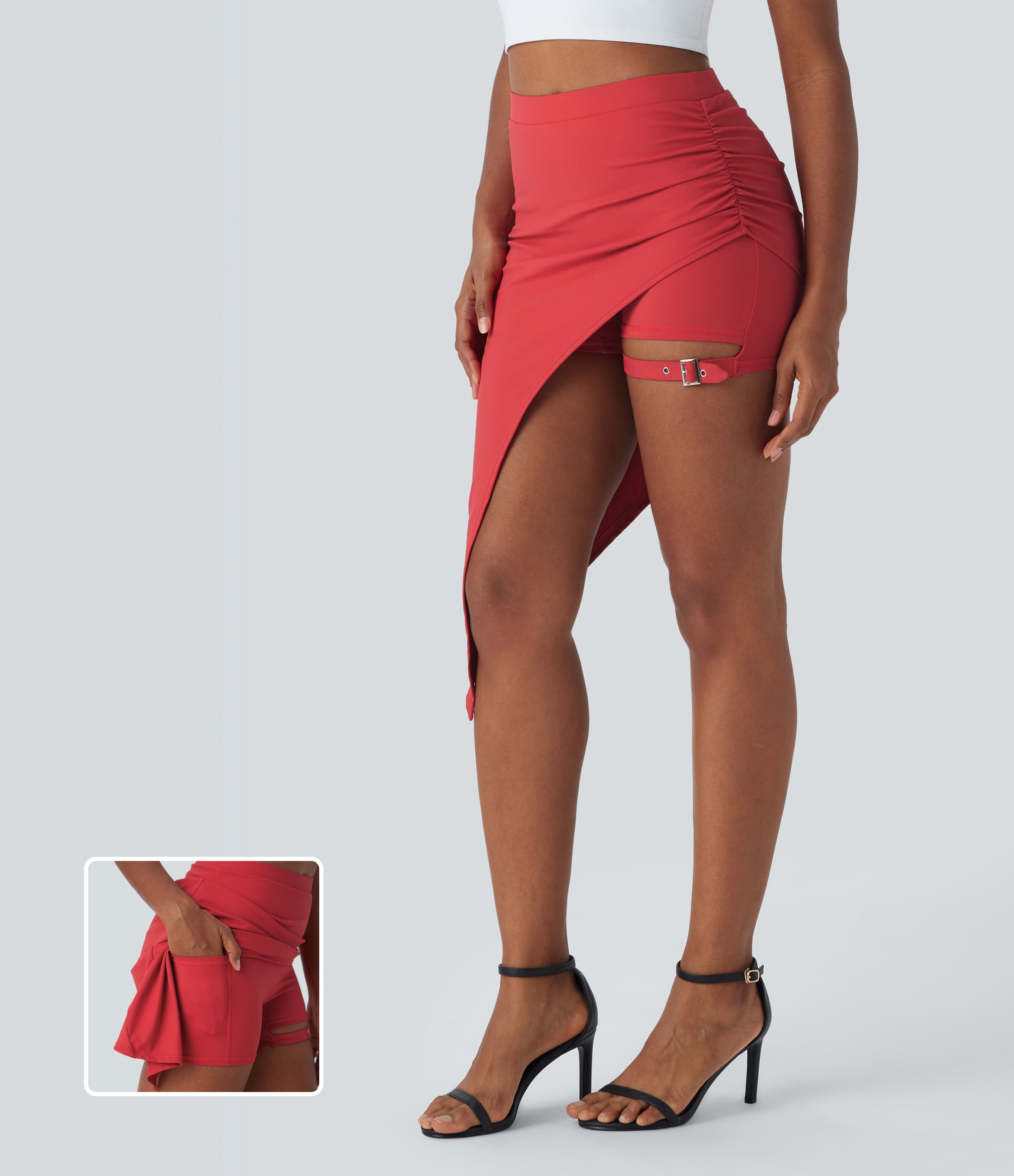 High Waisted Ruched Adjustable Buckle 2-in-1 Side Pocket High Low Dance Skirt