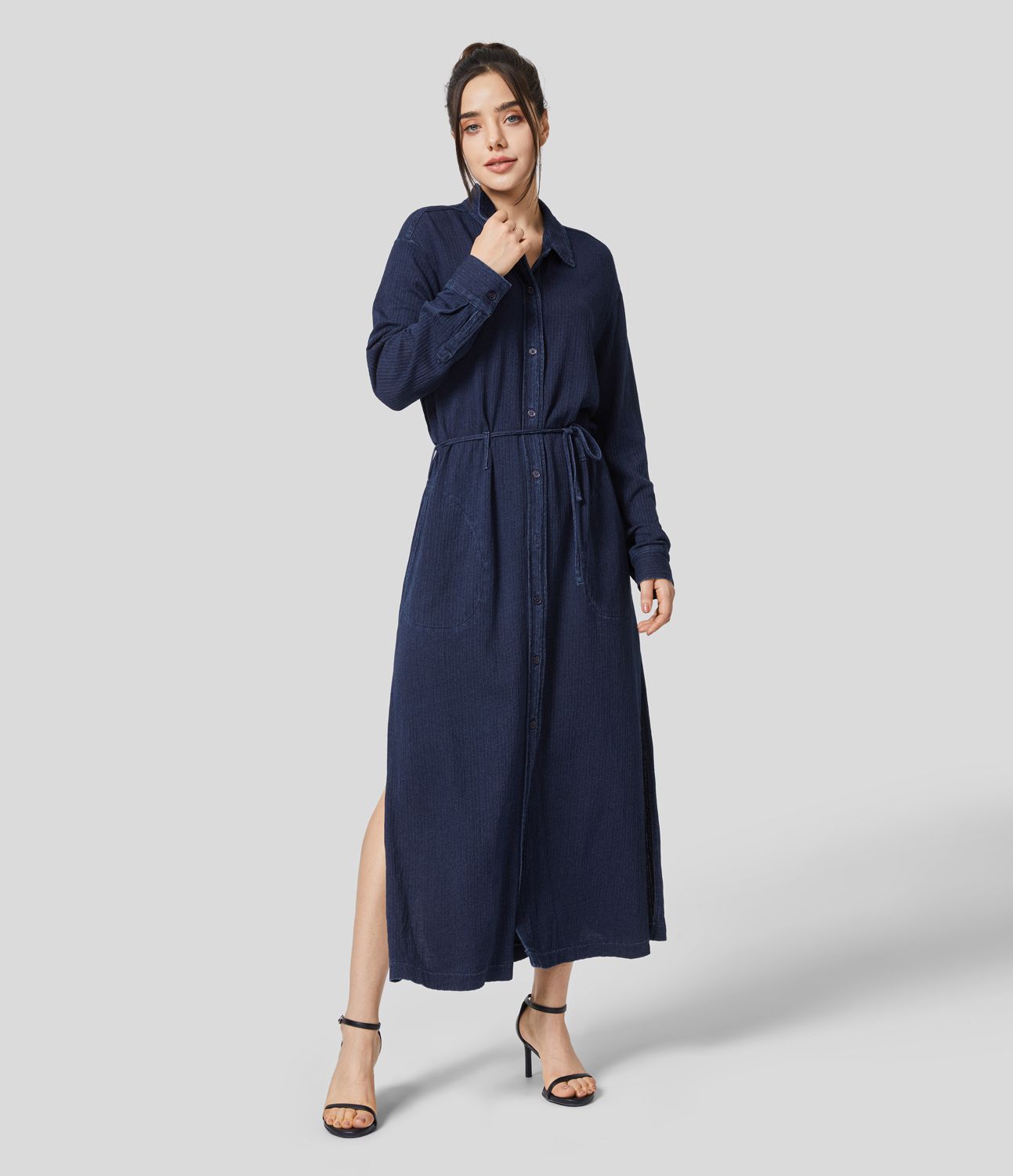 Halara Flex™ Collared Button Front Belted Side Pocket Split Hem Washed Stretchy Knit Denim Casual Shirt Dress