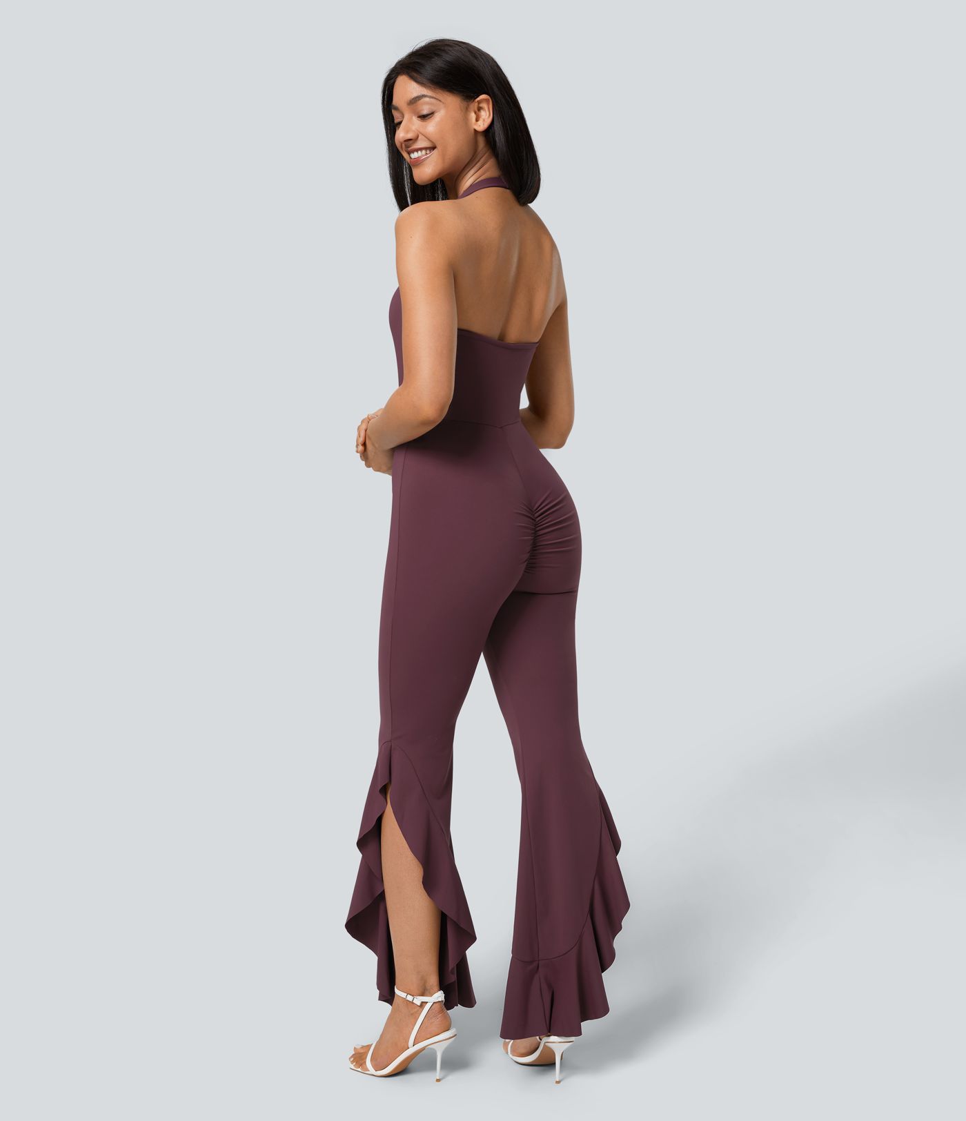 Backless Halter G-Hook Ruched Asymmetric Ruffle Skinny Casual Jumpsuit