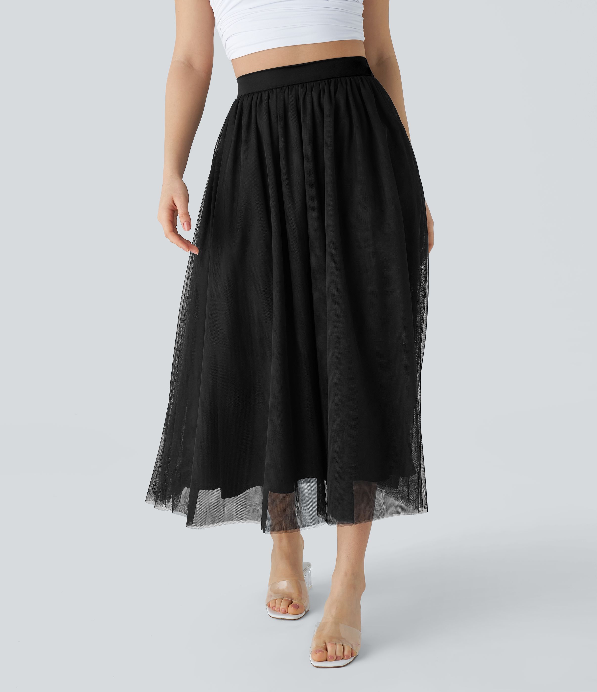 High Waisted Mesh Overlay Flowy Flare Midi Casual Skirt