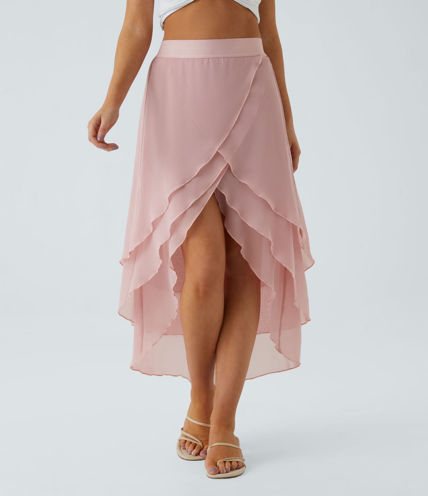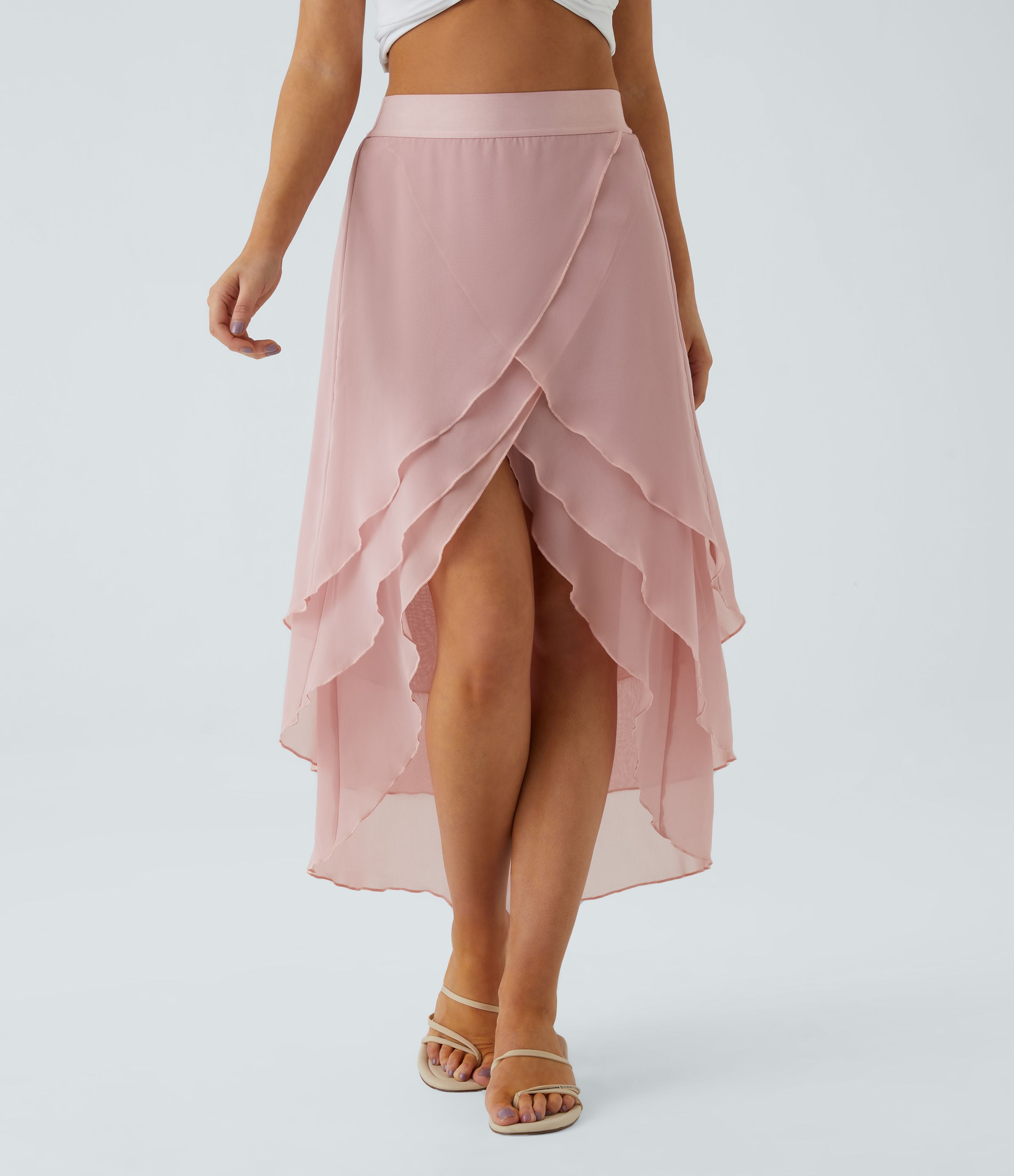 High Waisted Layered Ruffle Hem High Low Flowy Maxi Casual Skirt
