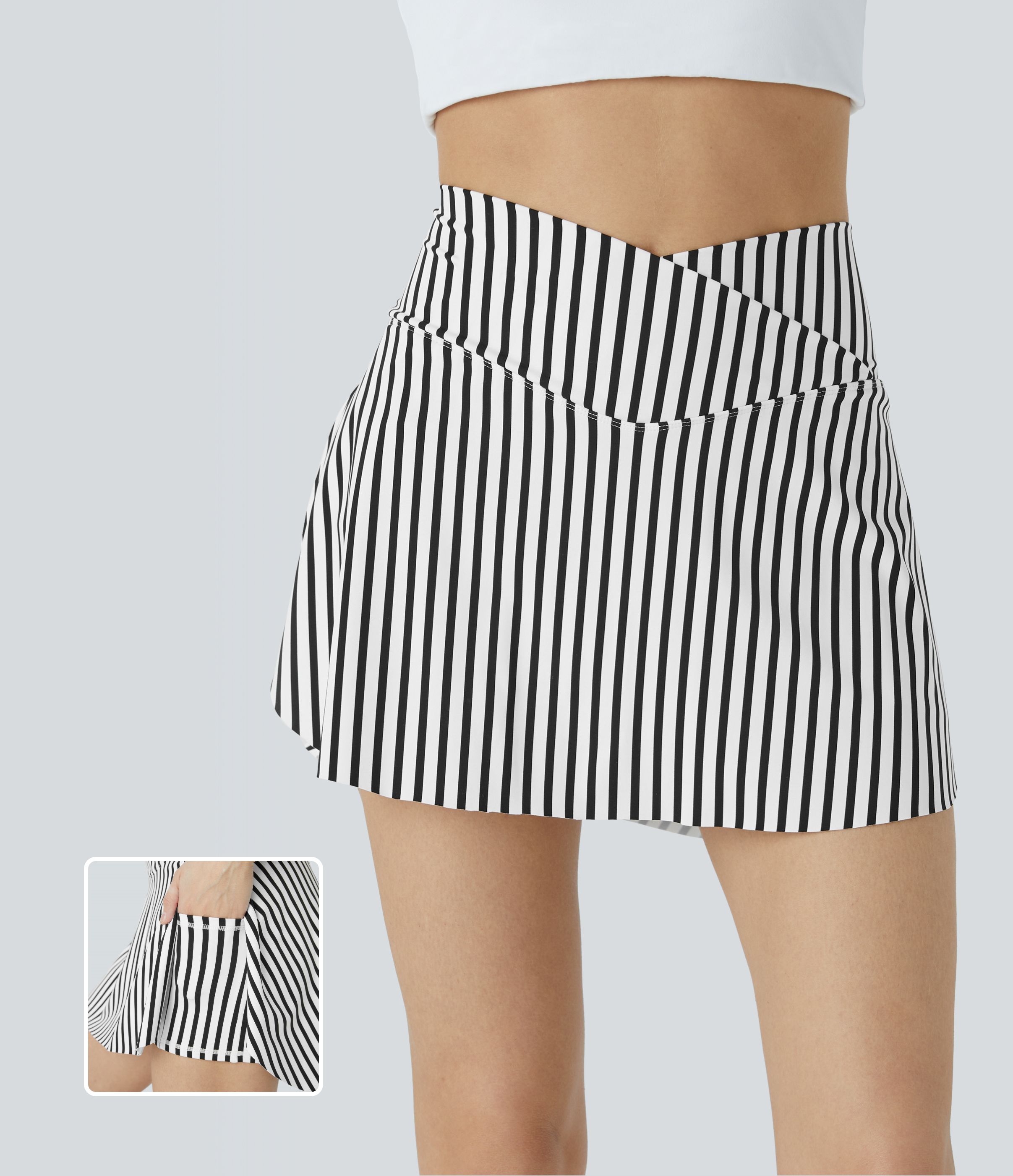 High Waisted Crossover 2-in-1 Side Pocket Striped Mini Tennis Skirt
