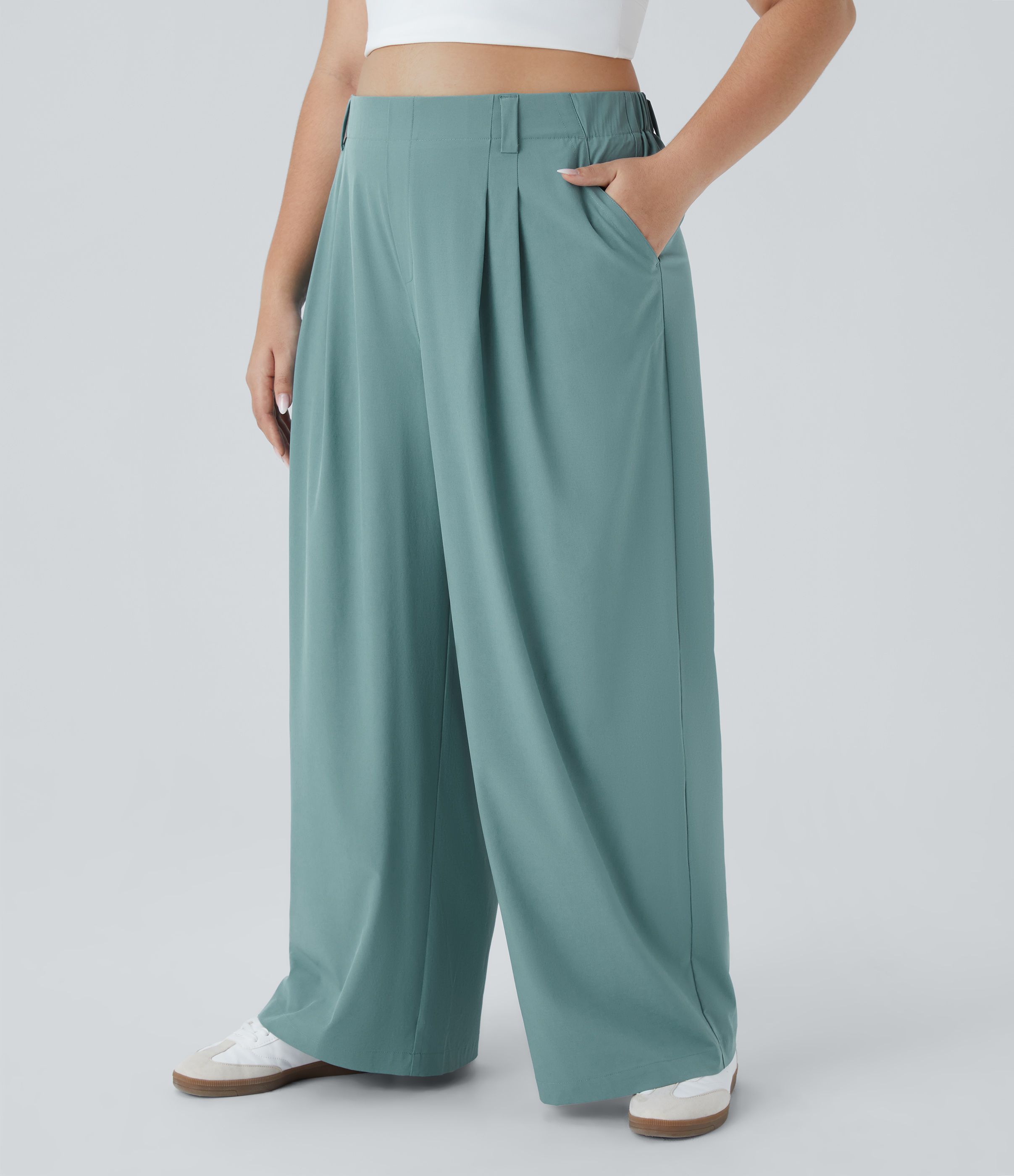 Breezeful™ High Waisted Side Pocket Wide Leg Flowy Solid Palazzo Quick Dry Casual Plus Size Trousers