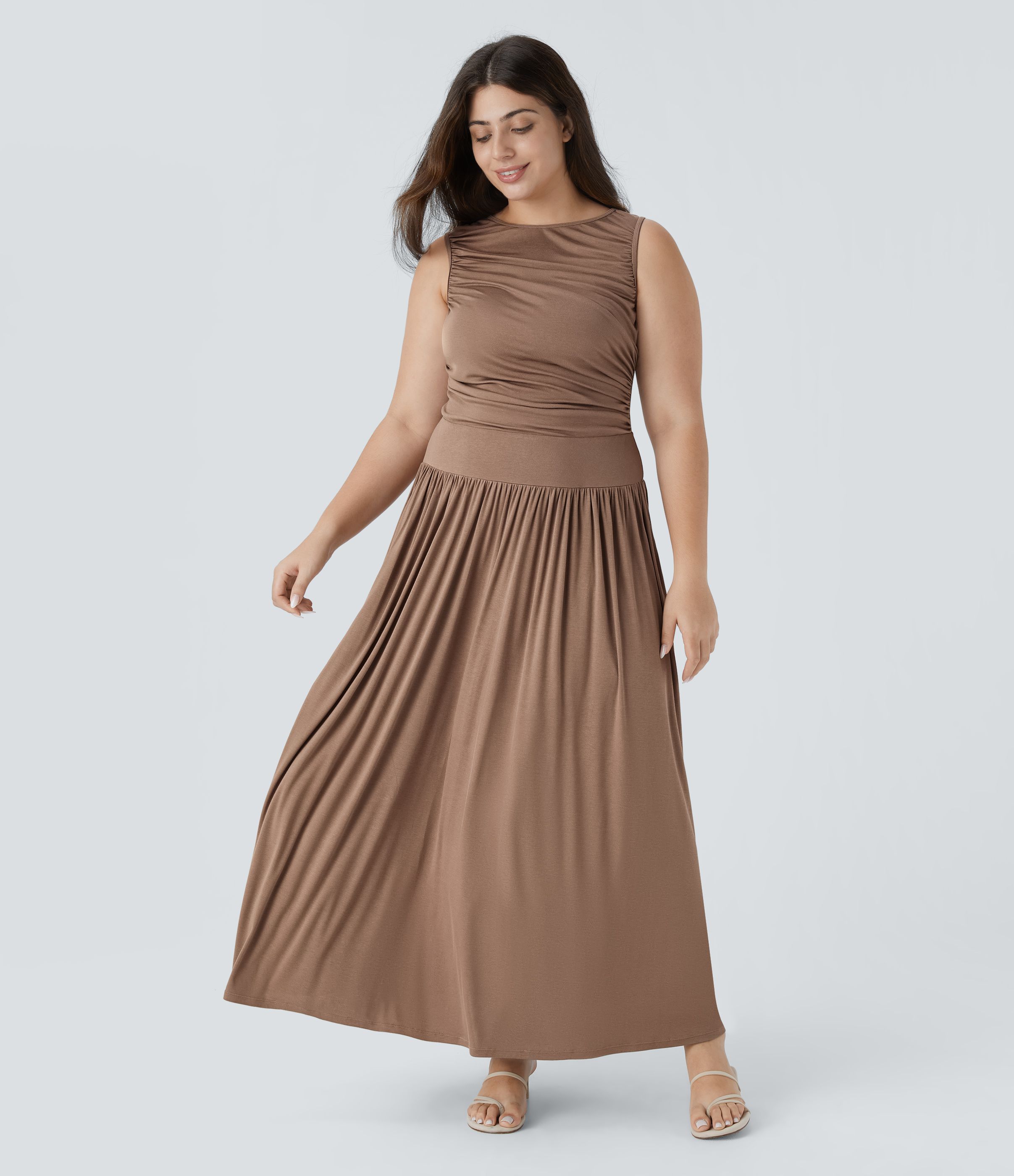 Ribbed Boat Neck Ruched Side Pocket Flowy Maxi Casual Plus Size Dress