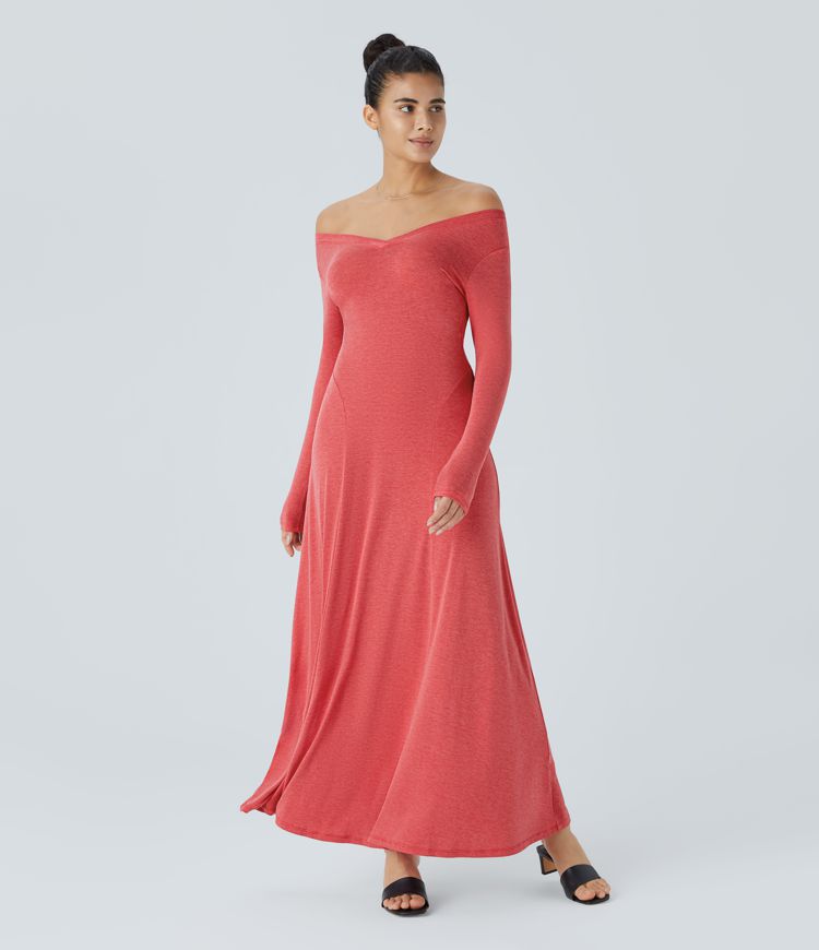 V Neck Long Sleeve Draped Maxi Casual Dress