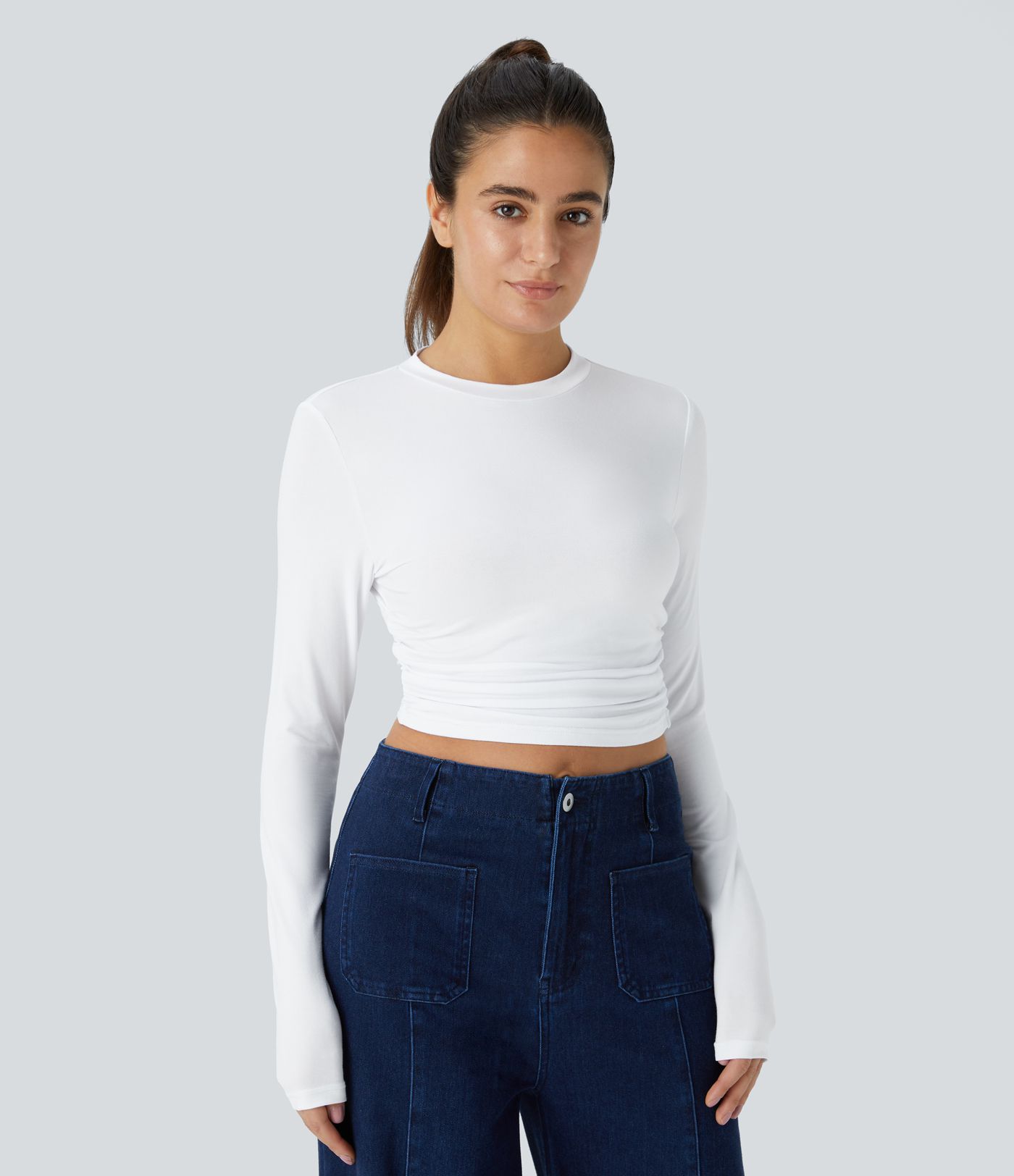 Round Neck Long Sleeve Ruched Skinny Cropped Casual Top