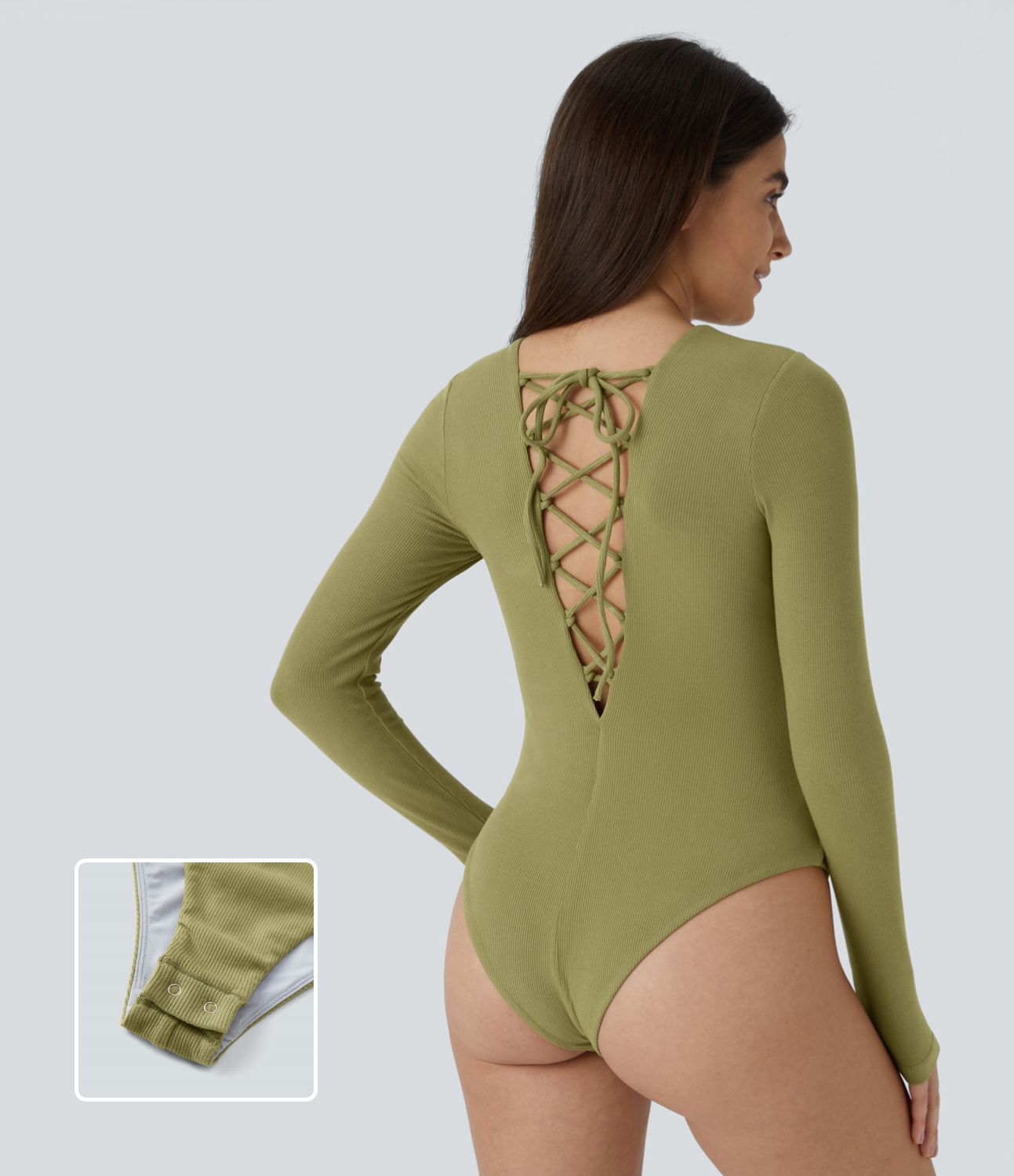 Ribbed Knit Crisscross Lace Up Long Sleeve Casual Bodysuit