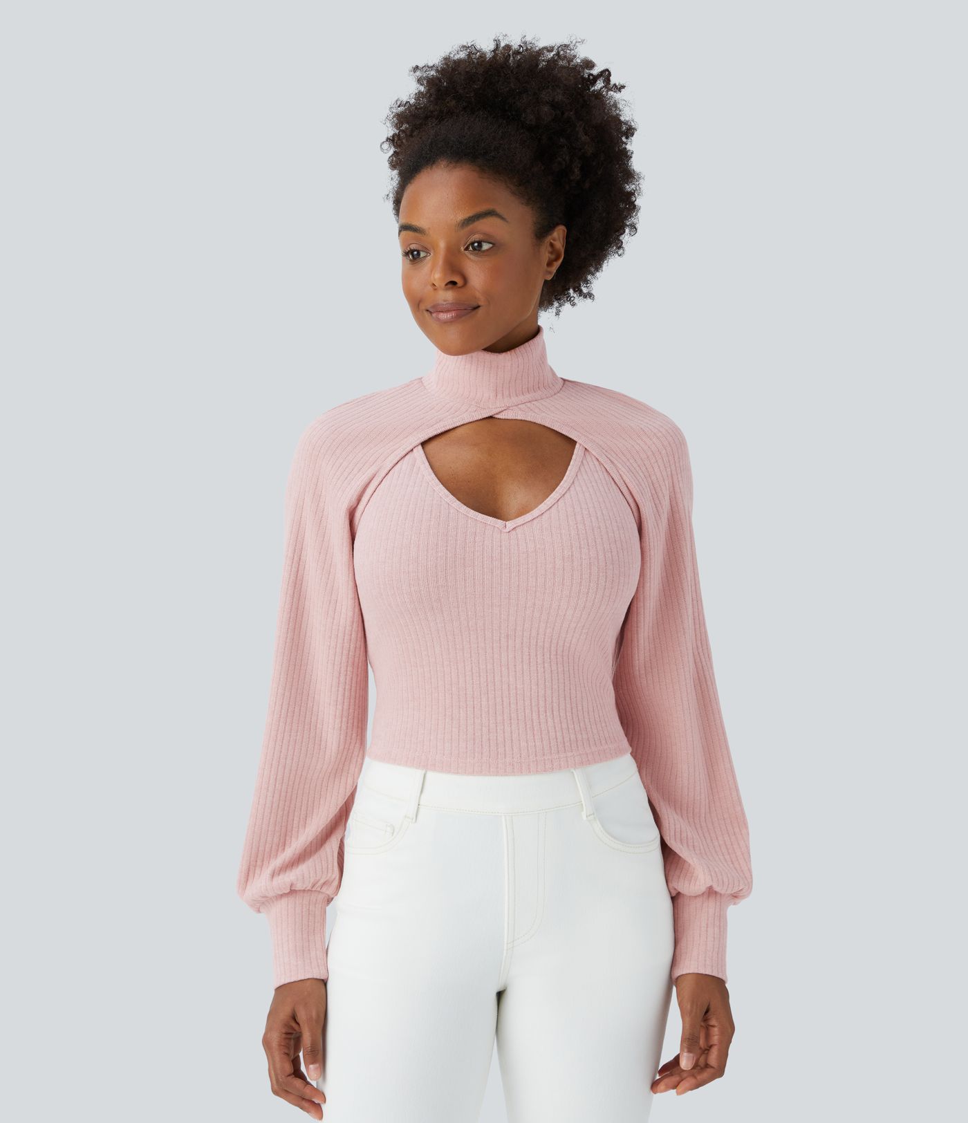 Ribbed Knit High Neck Long Sleeve Cut Out 2-Piece Casual Sweater