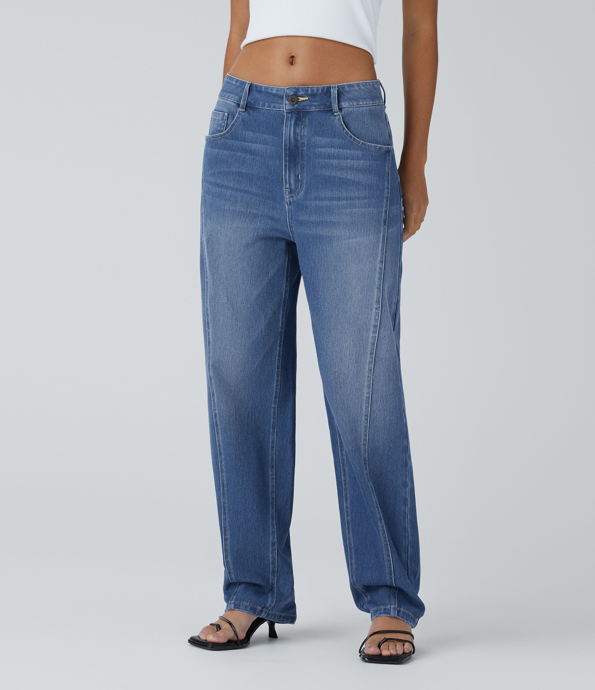 Halara Flex™ Mid Low Rise Button Zipper Multiple Pockets Washed Stretchy Knit Casual Baggy Mom Jeans