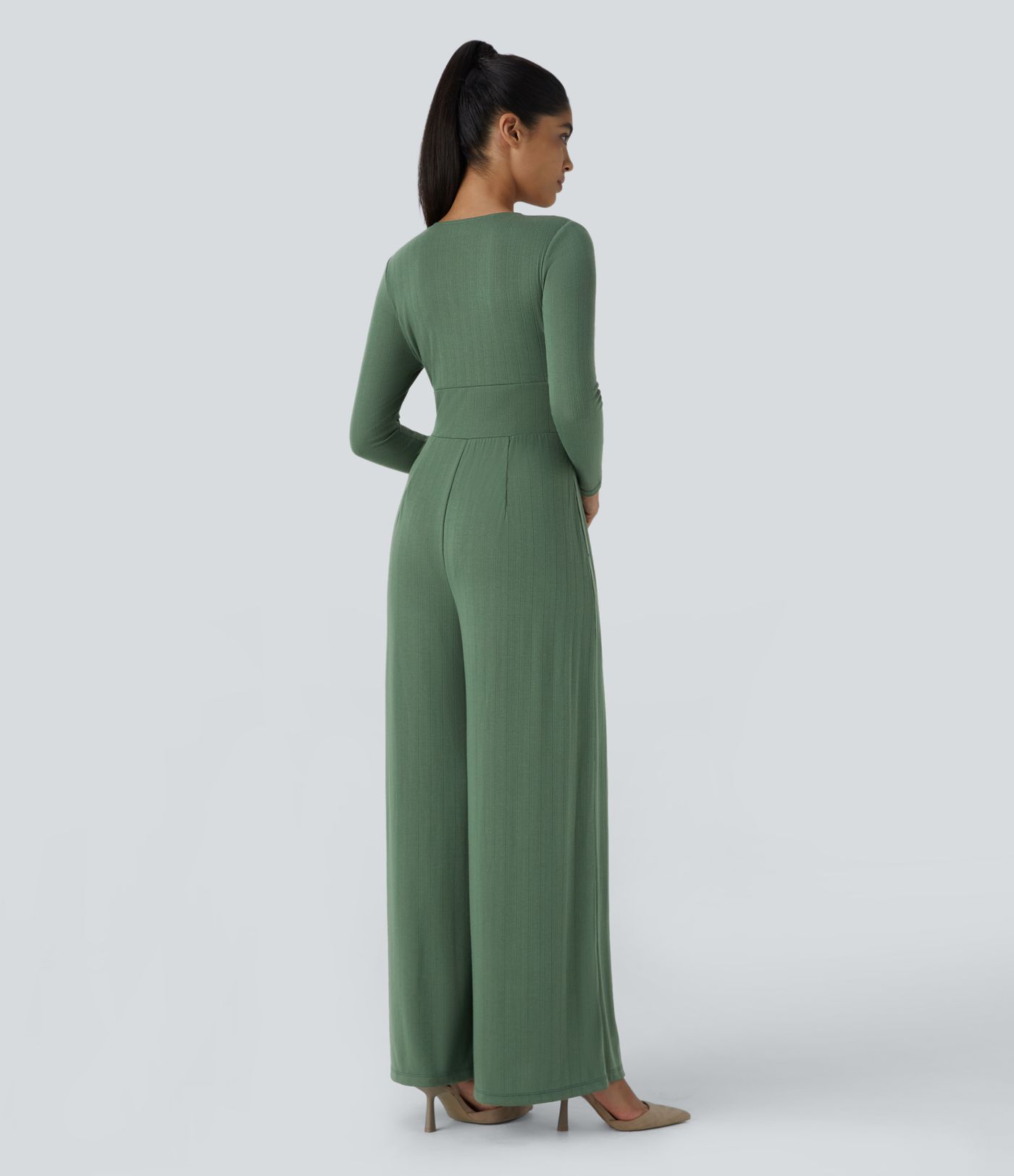 Ribbed Knit Deep V Neck Long Sleeve Side Pocket Palazzo Wide Leg Casual Jumpsuit