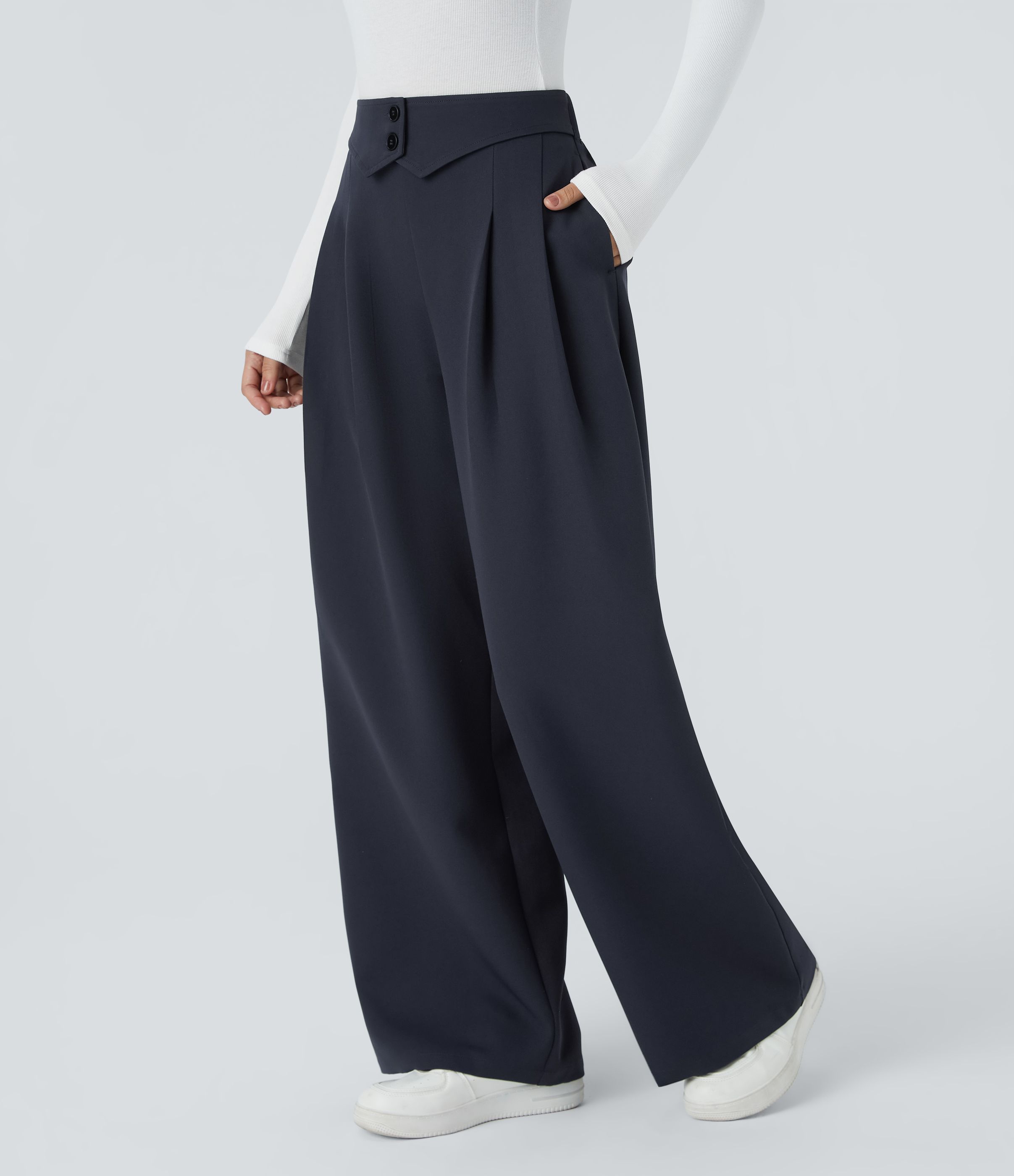 High Waisted Decorative Button Invisible Zipper Side Pocket Wide Leg Work Trousers