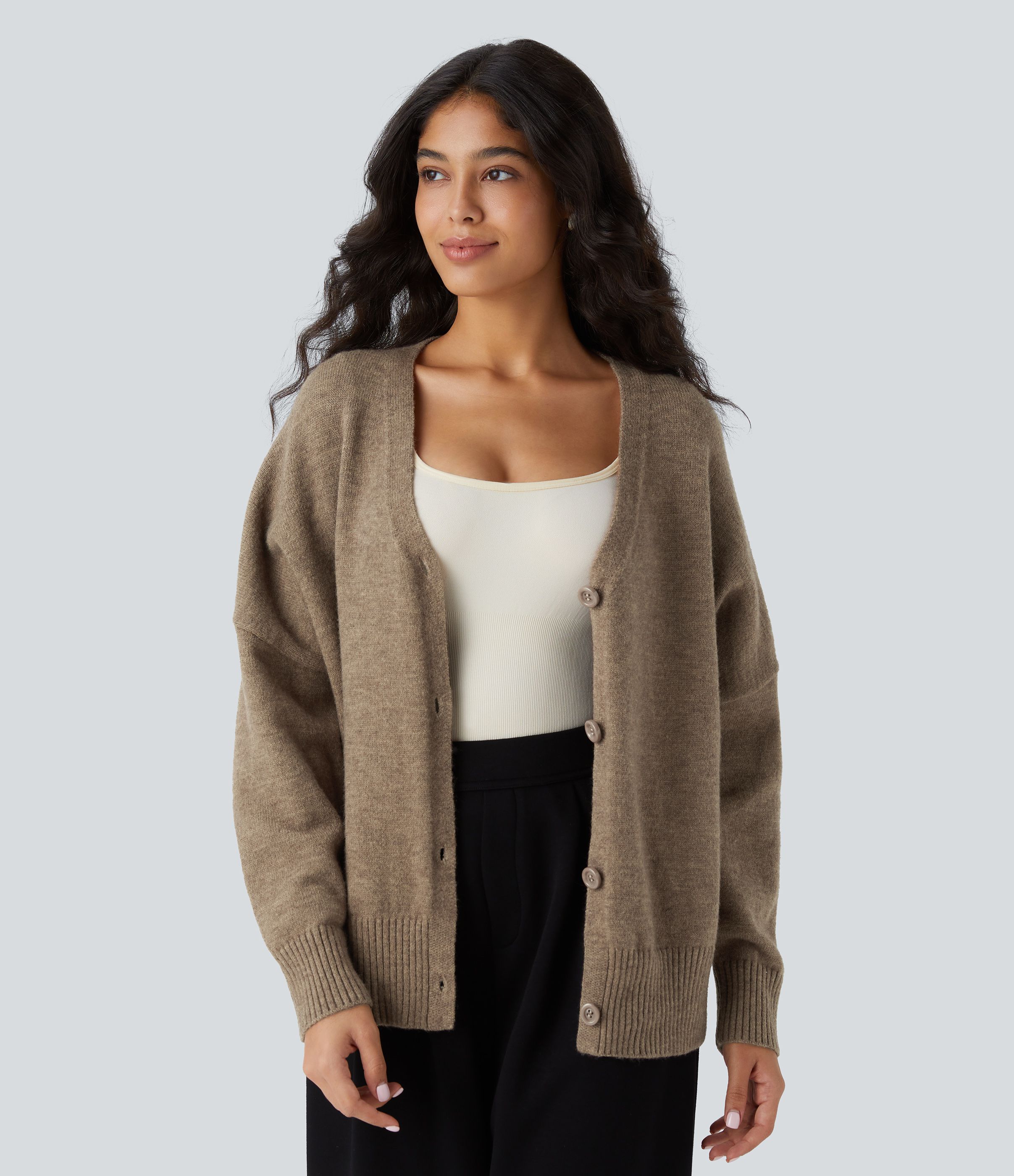 V Neck Dropped Shoulder Long Sleeve Button Oversize Work Cardigan