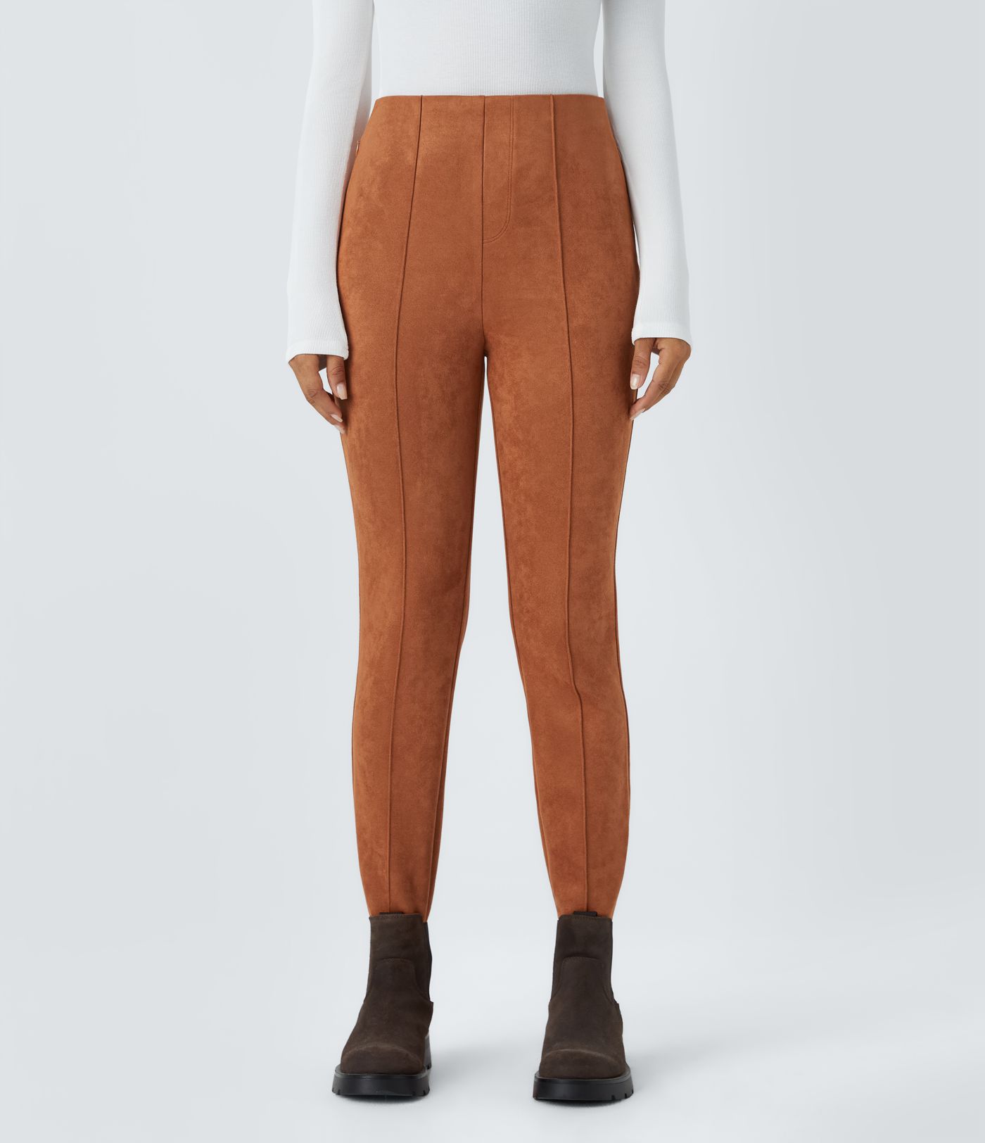 High Waisted Side Zipper Pocket Slim Suede Work Trousers