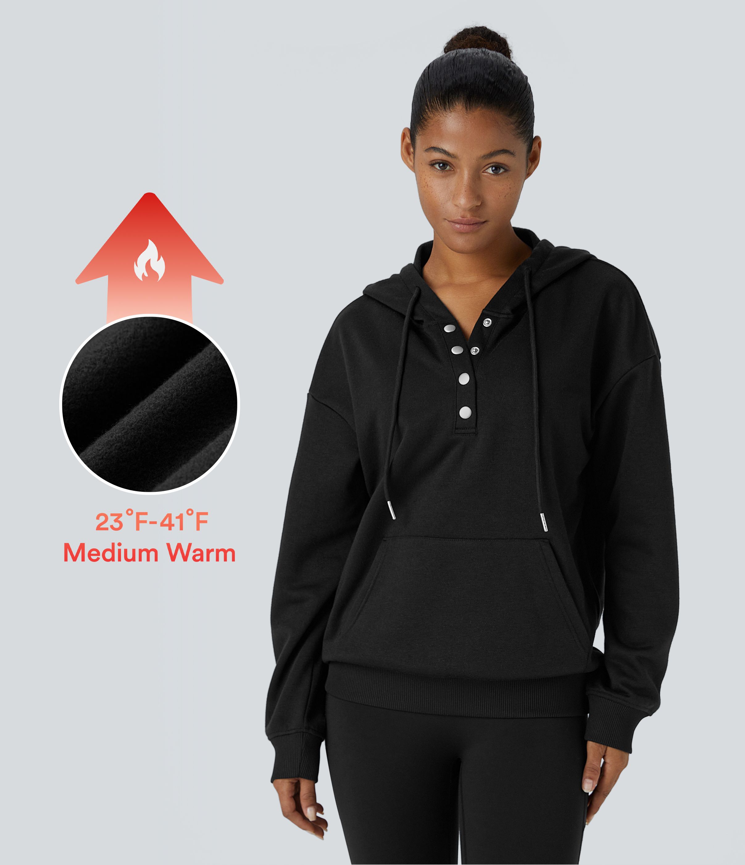 Hooded Drawstring Snap Button Kangaroo Pocket Relaxed Fleece Casual Sweatshirt
