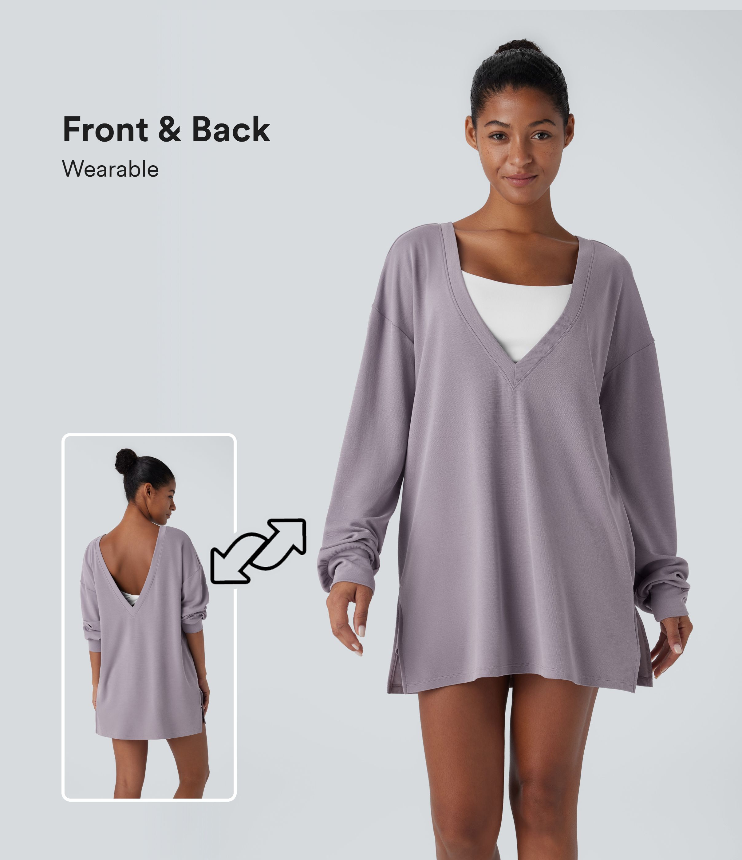 V Neck Dropped Shoulder Side Pocket Split Relaxed Casual Sweatshirt-Front and Back Wearable