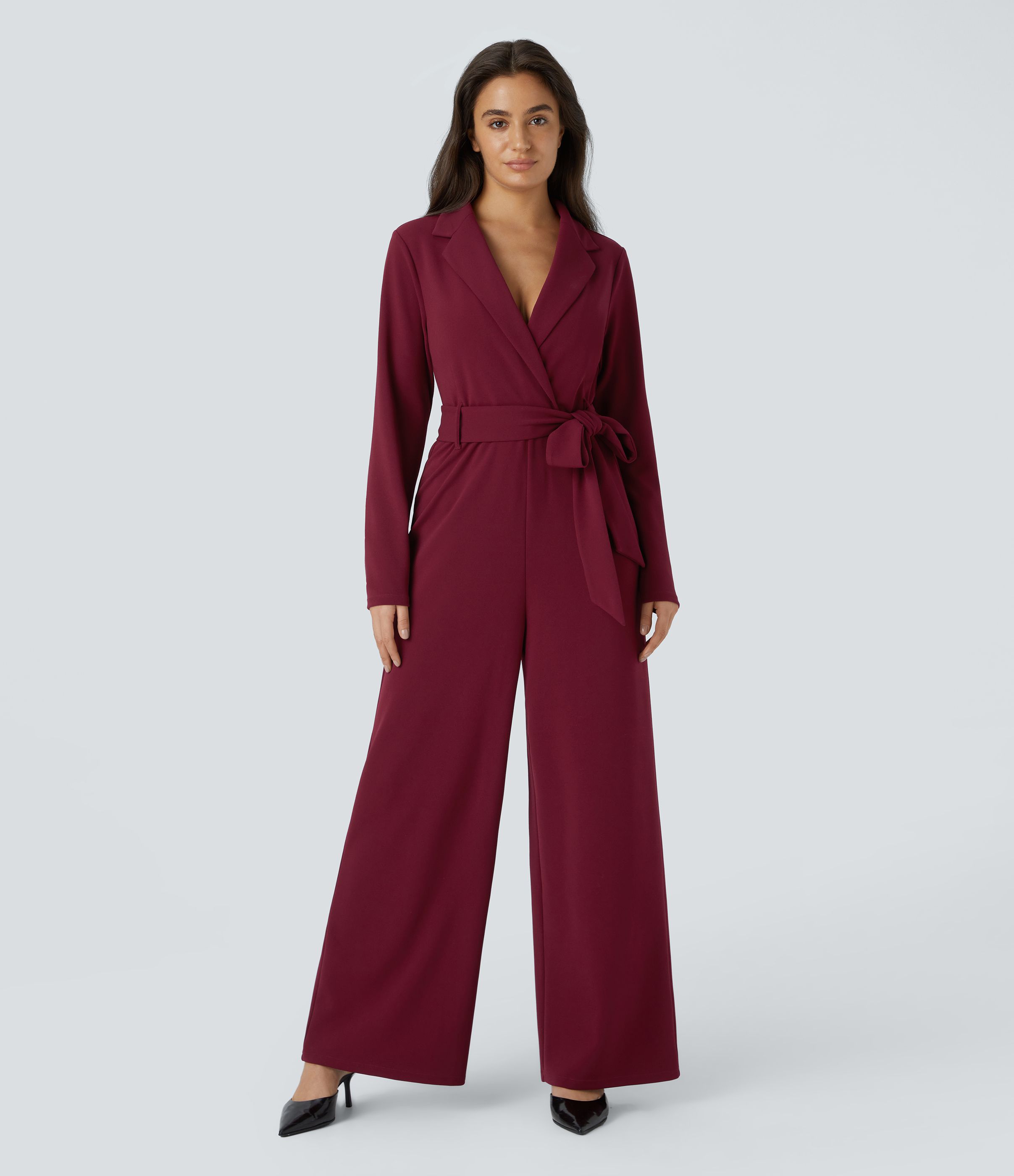 Notched Collar Long Sleeve Belted Casual Jumpsuit