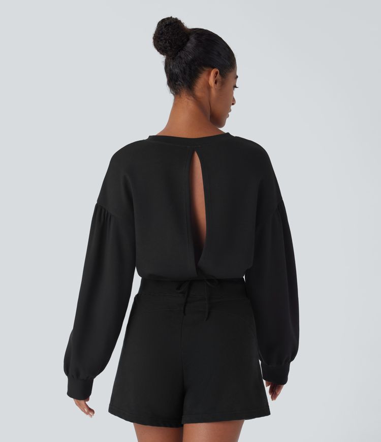 Backless Drawstring Tie Back Bishop Sleeve Cropped Casual Sweatshirt