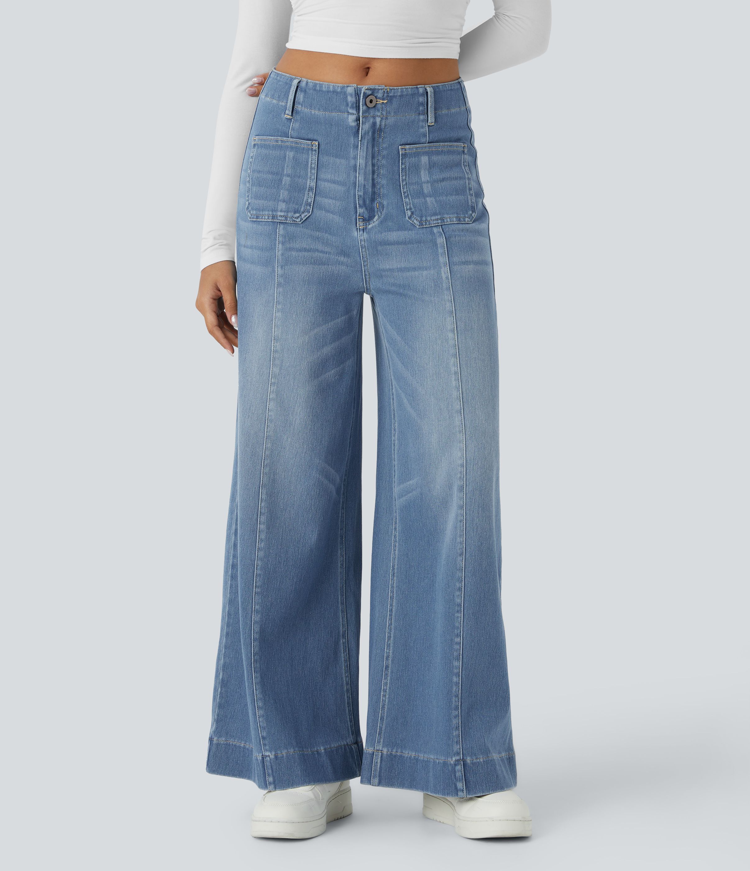 Halara Flex™ Mid Rise Button Zipper Front Pocket Wide Leg Washed Stretchy Knit Casual Jeans