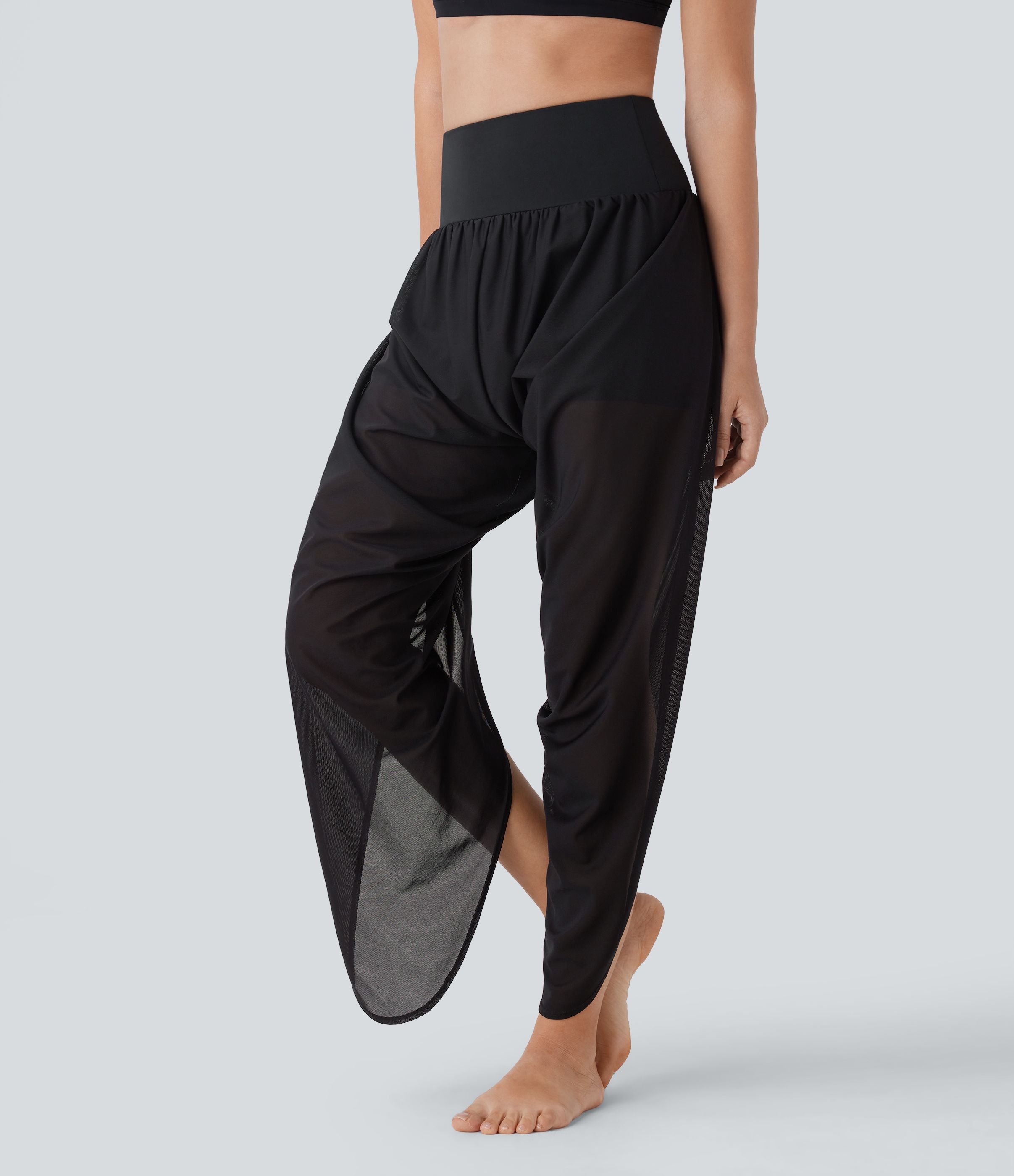 High Waisted 2-in-1 Side Pocket Ruched Contrast Mesh Split Yoga Joggers