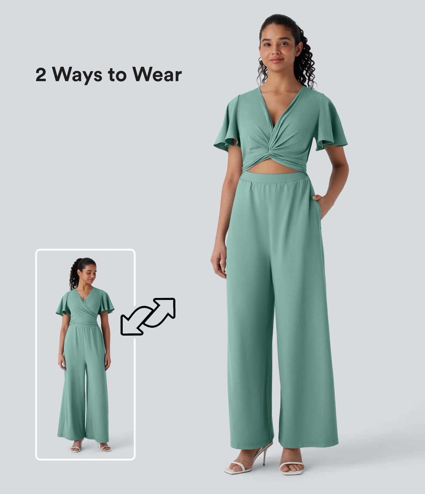 V Neck Butterfly Sleeve Twisted Tie Back Side Pocket Wide Leg Flowy Casual Jumpsuit