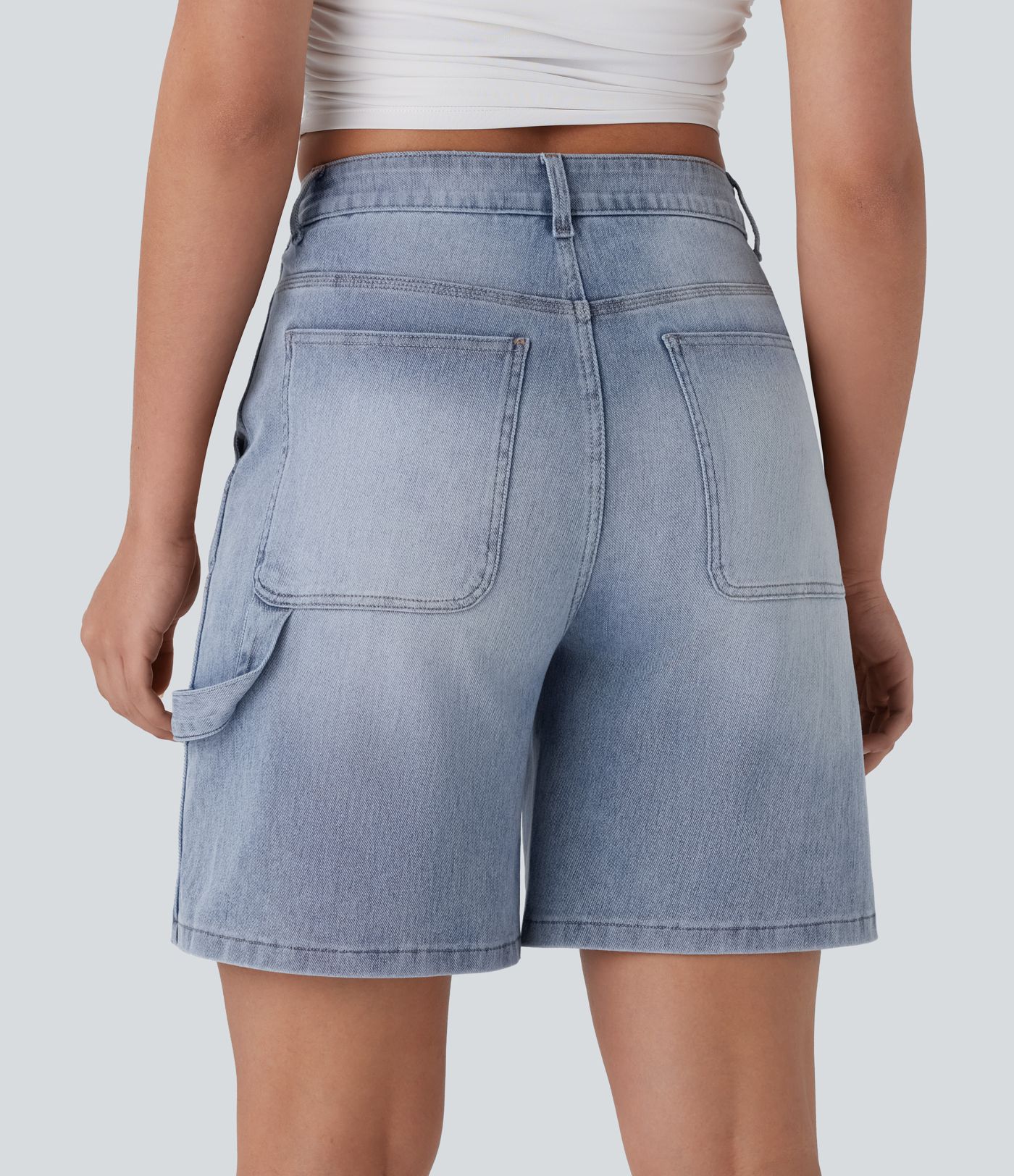 Halara Flex™ Mid Rise Multiple Pockets Washed Stretchy Knit Denim Casual Bermuda Shorts