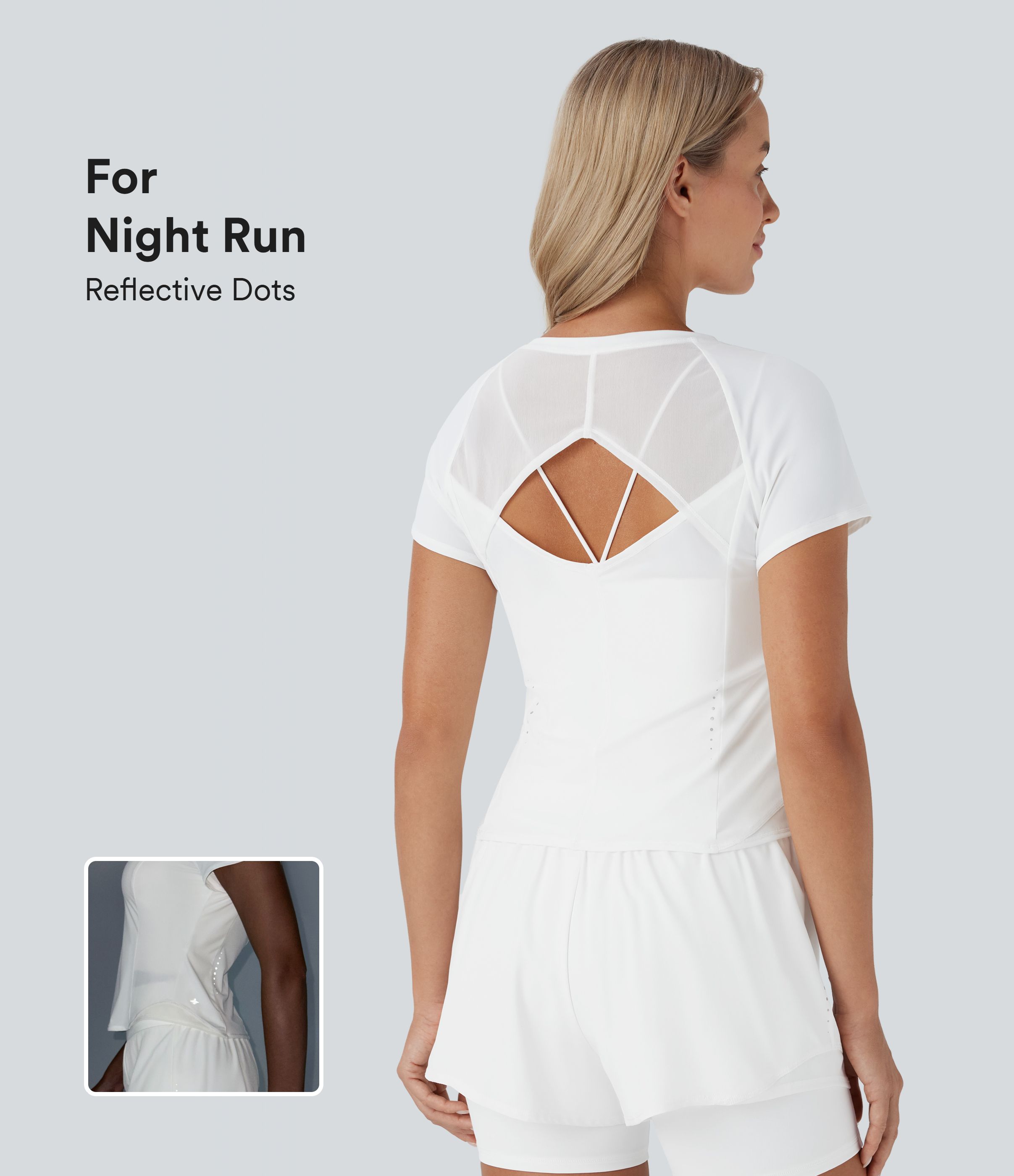 Reflective Round Neck Short Sleeve Contrast Mesh Cut Out Quick Dry Running Sports Top