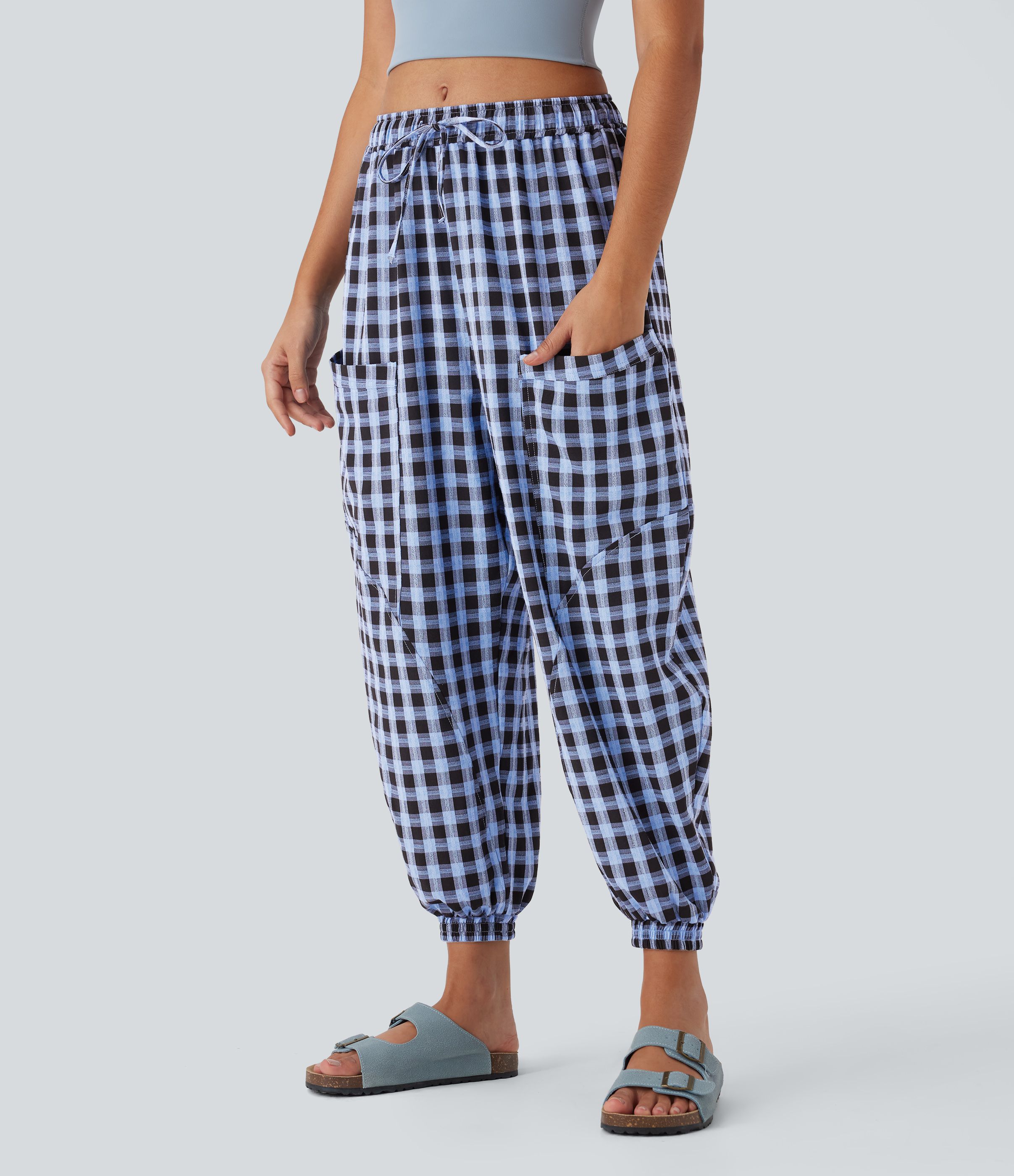 Mid Rise Drawstring Multiple Pockets Plaid Casual Barrel Leg Joggers