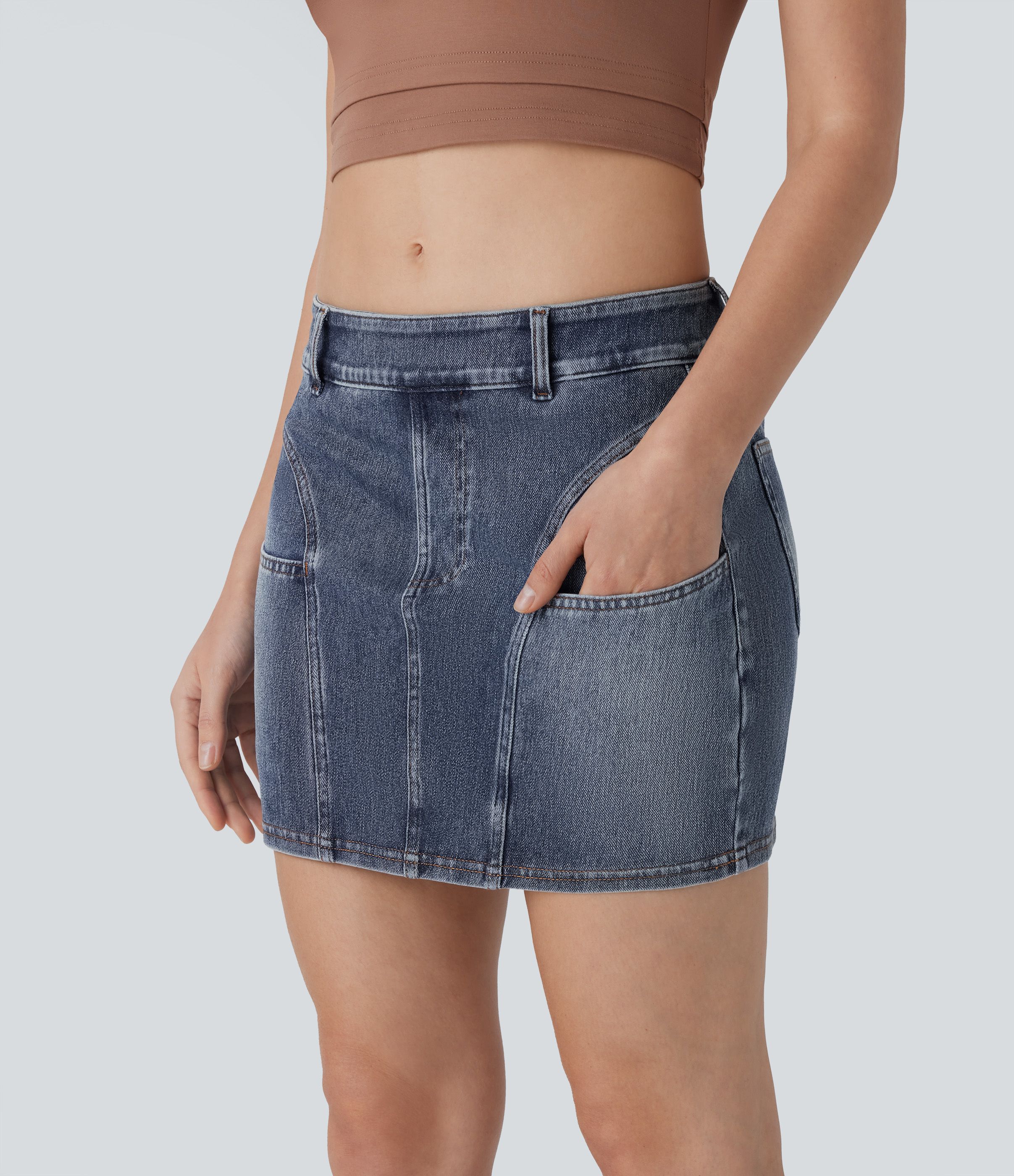 Halara Flex™ Low Rise Bodycon Mini Washed Stretchy Knit Denim Casual Skirt with Pockets