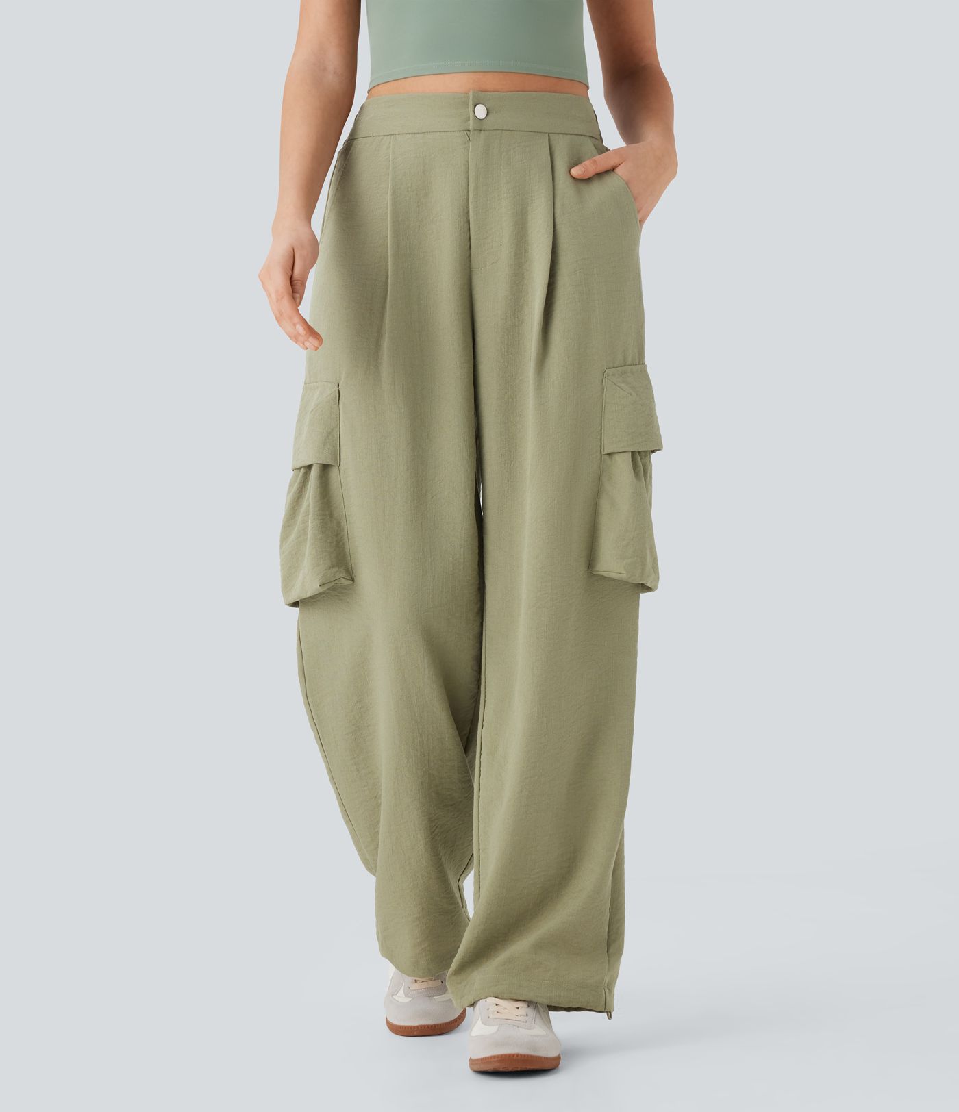 High Waisted Adjustable Drawstring Hem Linen-Feel Casual Cargo Trousers with Multiple Pockets