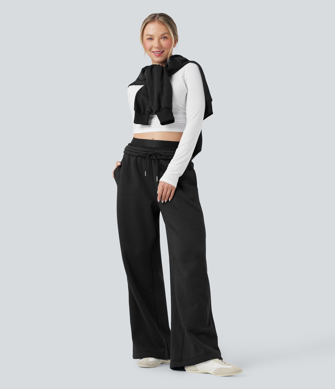 High Waisted Drawstring Wide Leg Fleece Casual Cotton Trousers with Pockets
