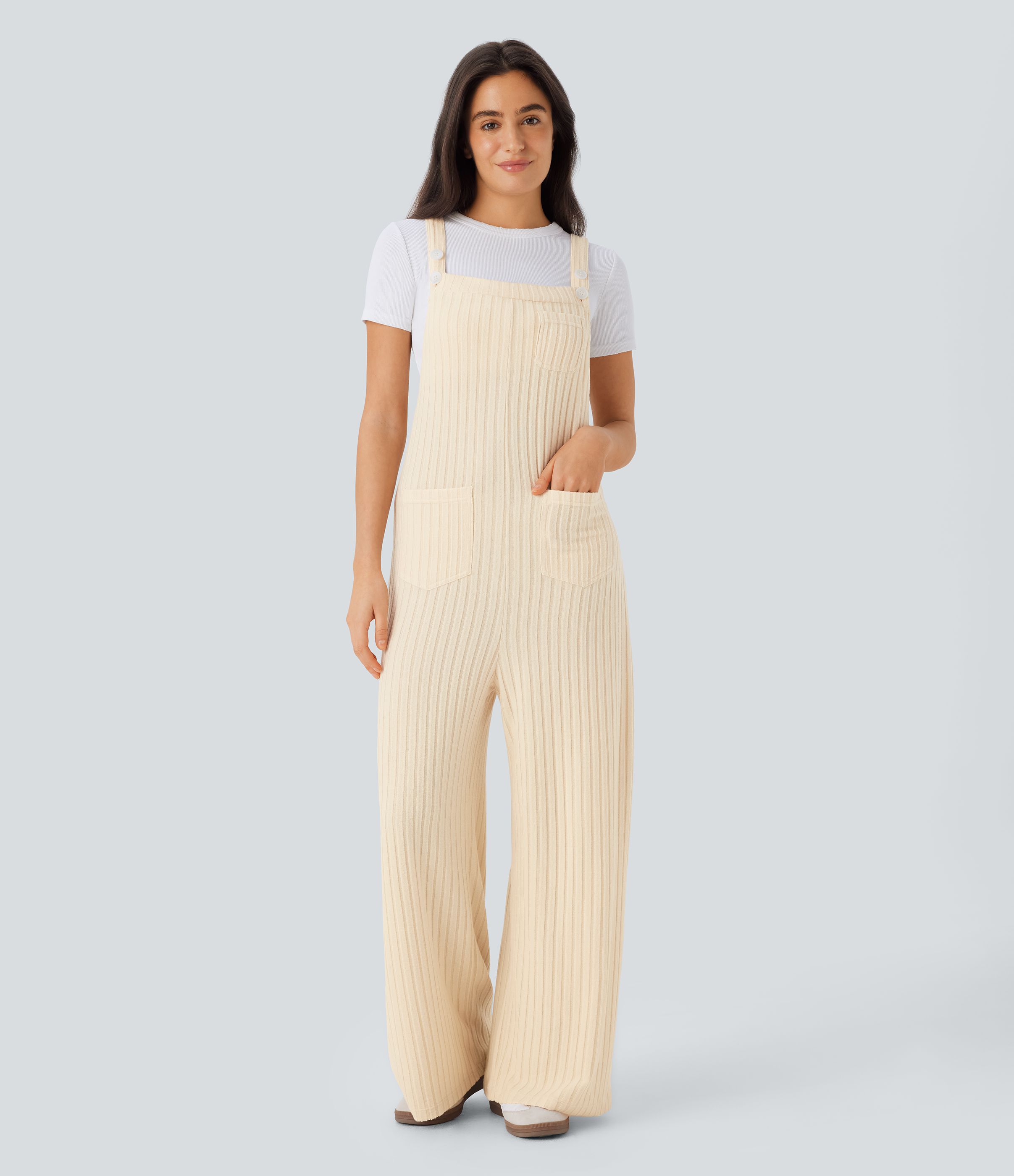 Ribbed Knit Pockets Casual Overalls