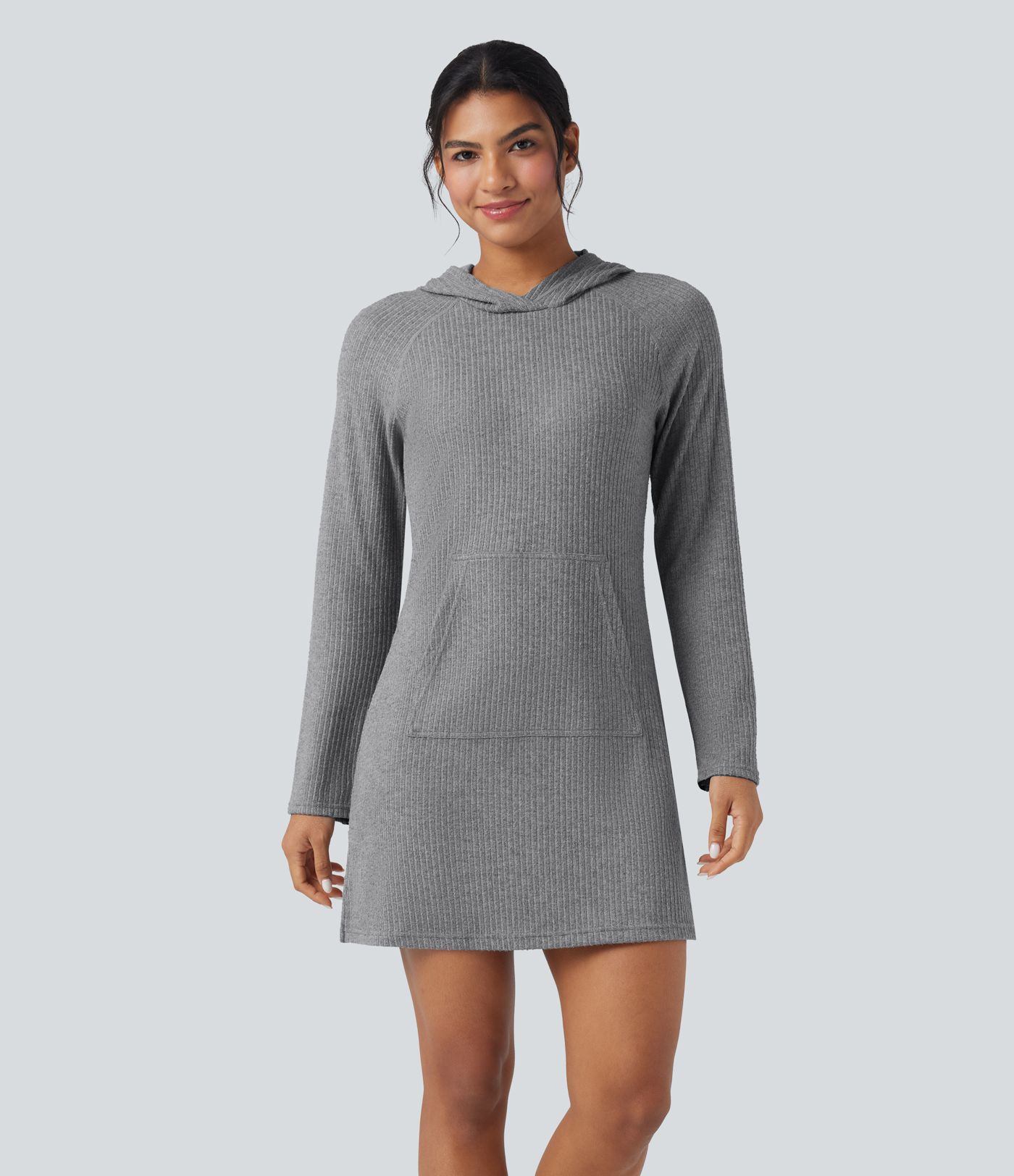 Ribbed Knit Hooded Long Sleeve Mini Hiking Active Dress with Pocket