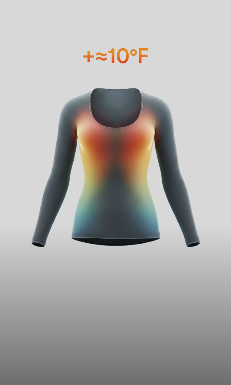 Quick-warming fabric +≈10°F; heat-retaining fibers hold it in.