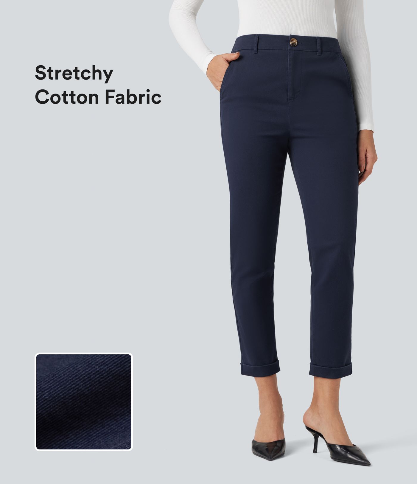 Mid Rise Slim Casual 7/8 Chino Cotton Trousers with Pockets