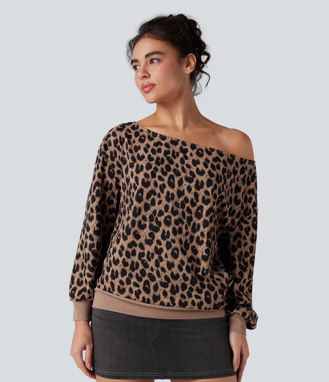 One-shoulder Long Sleeve Waffle Leopard Casual Sweatshirt with Pockets