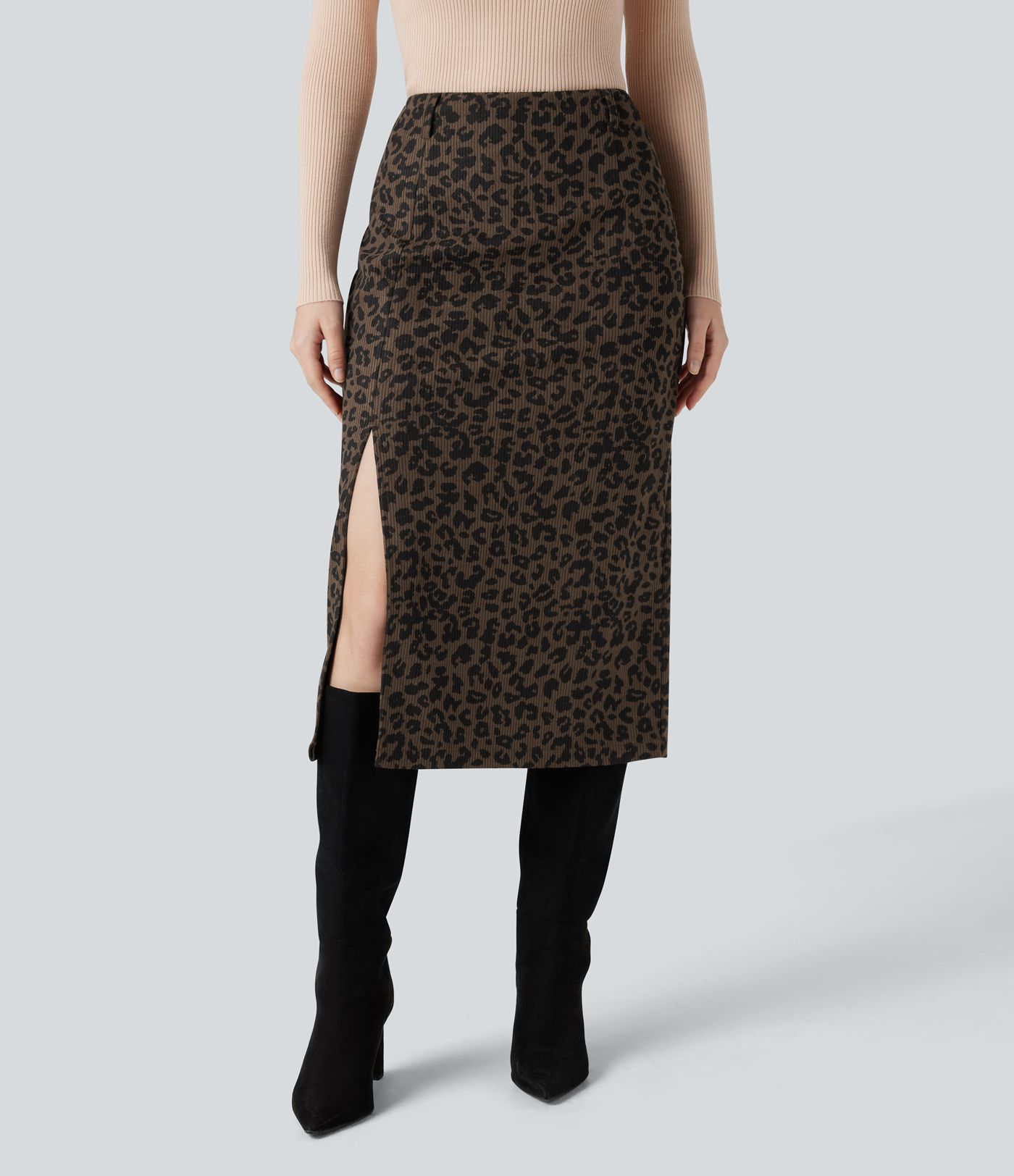 High Waisted Split Hem Midi Leopard Print Corduroy Casual Pencil Skirt