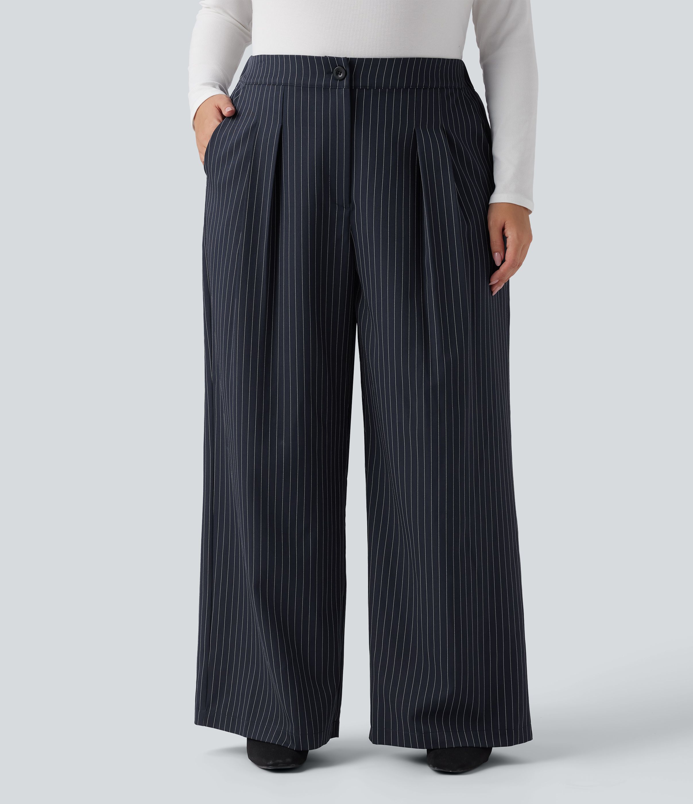 High Waisted Wide Leg Striped Work Plus Size Trousers with Pockets