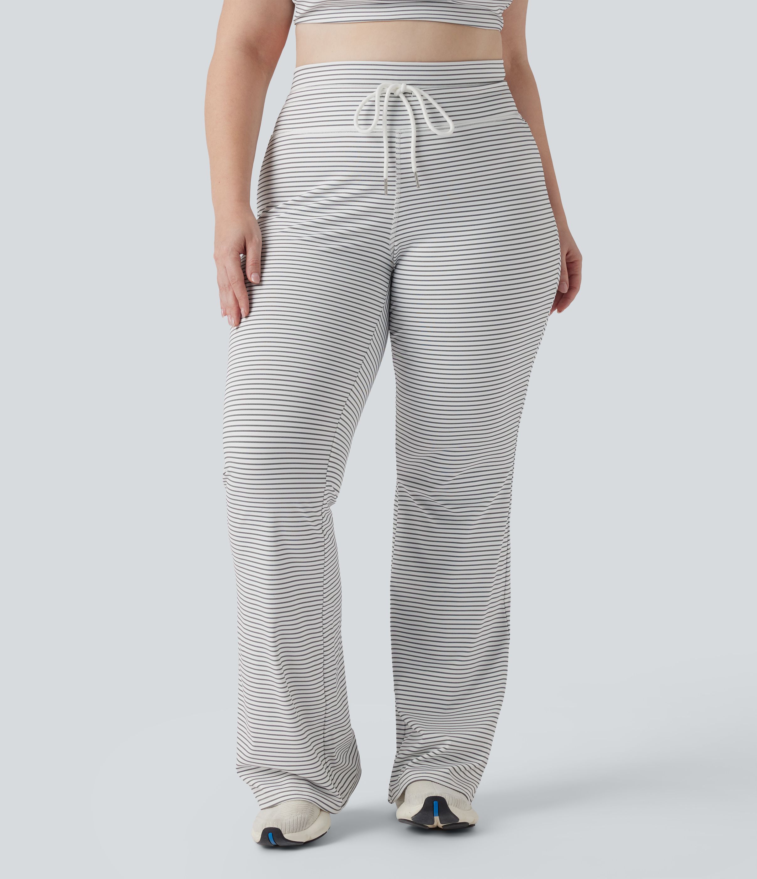 High Waisted Drawstring Stripe Flare Yoga Plus Size Trousers with Pockets