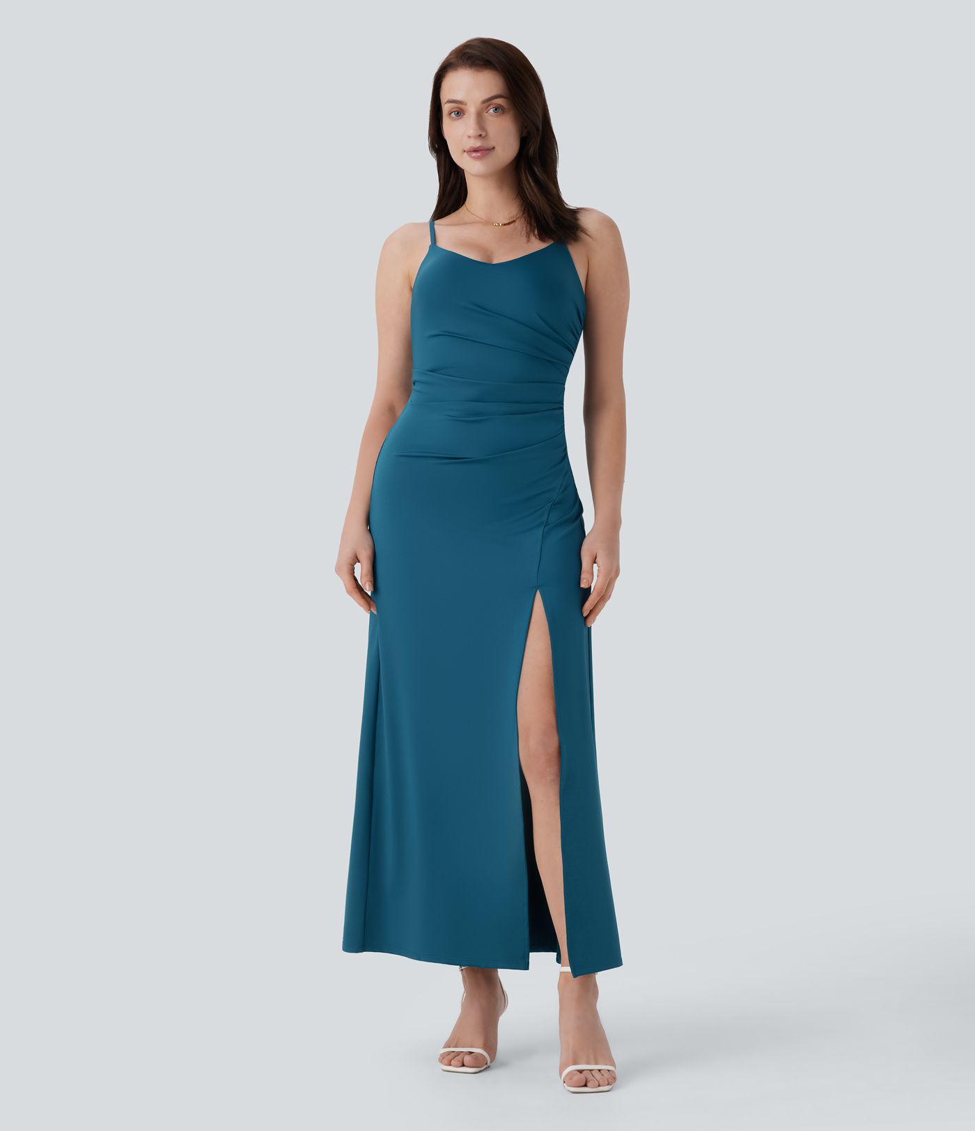 Adjustable Strap Ruched Split Maxi Bridesmaid and Wedding Guest Dress
