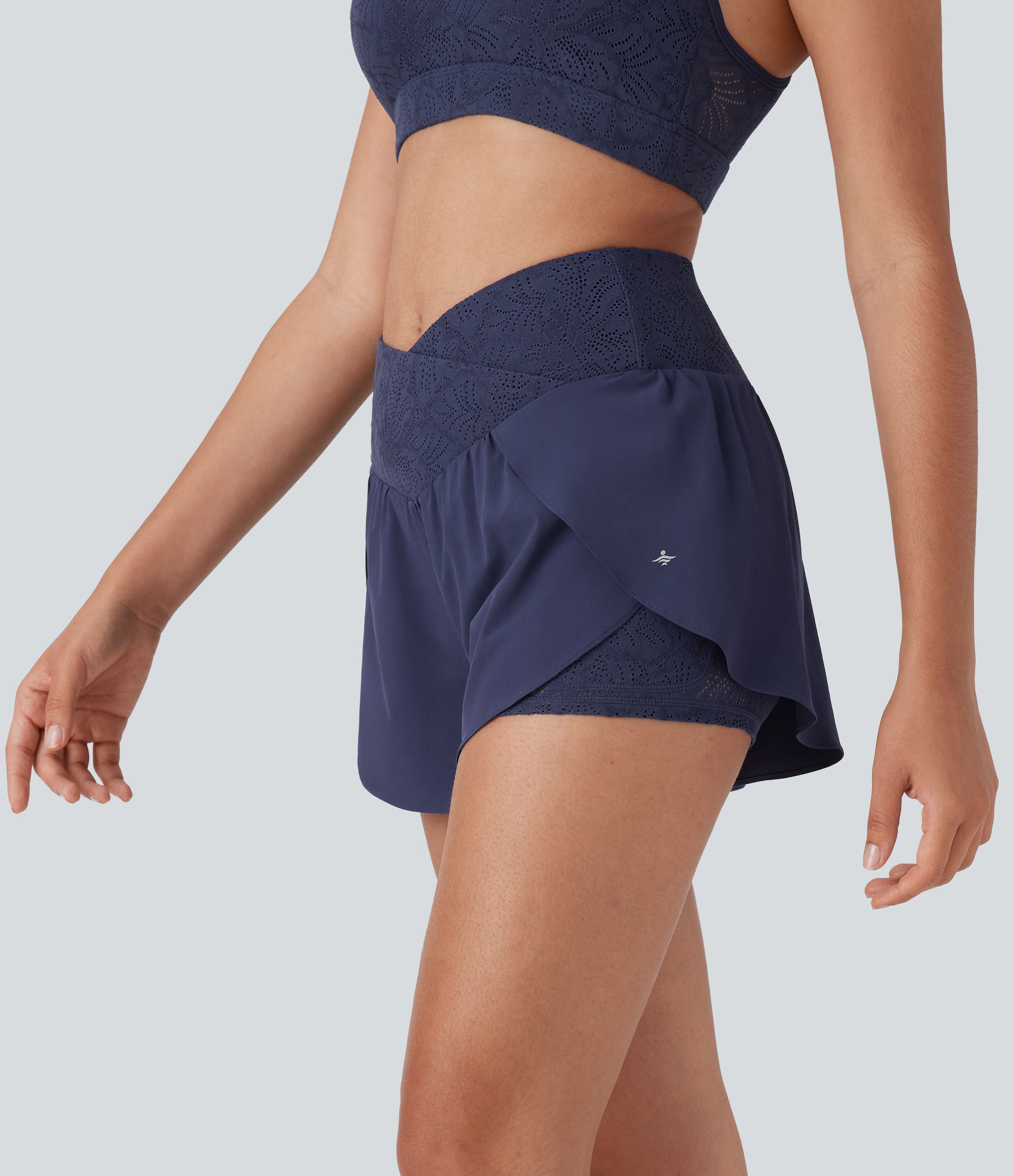 Breezeful™ High Waisted Crossover 2-in-1 Side Pocket Contrast Lace Quick Dry Yoga Shorts 3''
