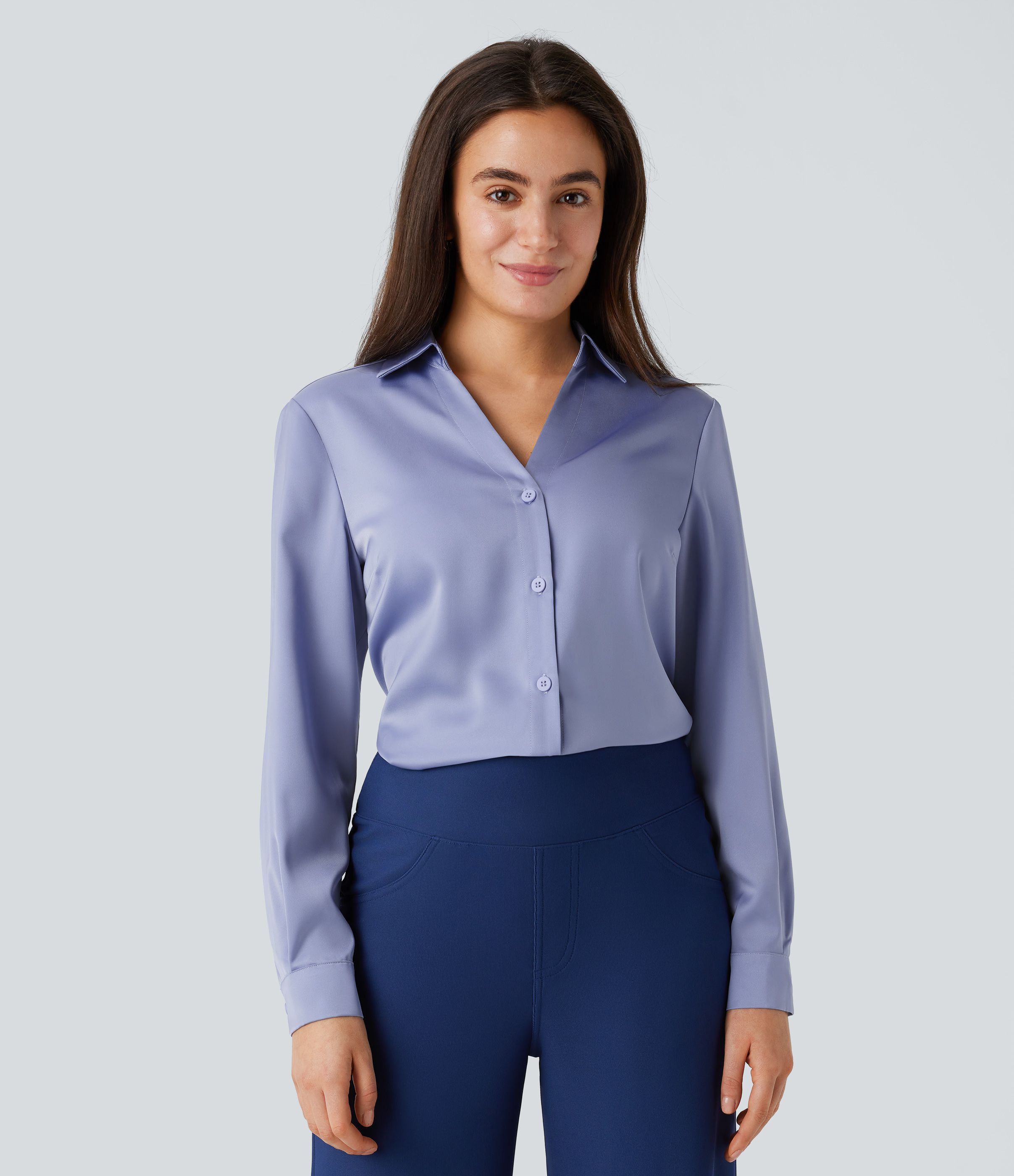 Collared Button Long Sleeve Curved Hem Satin Work Shirt