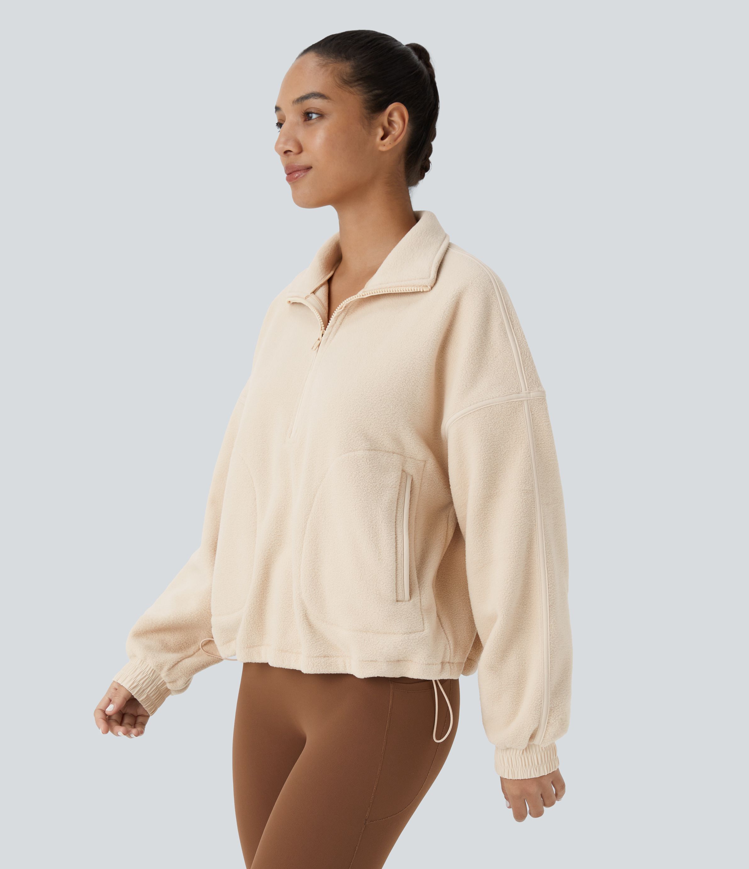 Collared Half Zip Long Sleeve Side Pocket Drawstring Relaxed Fleece Hiking Sports Sweatshirt