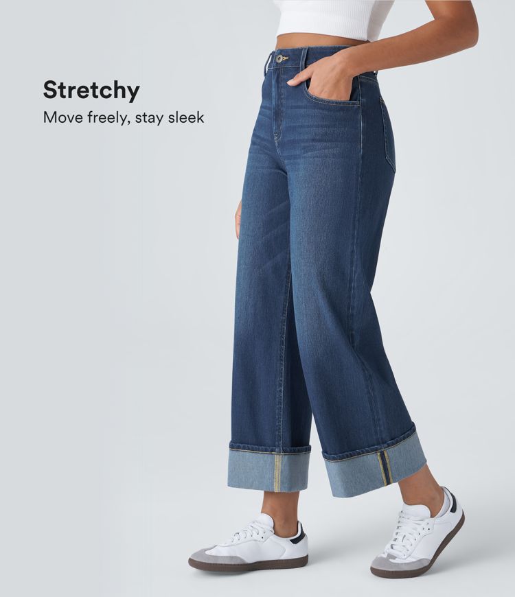 Halara Flex™ High Waisted Pockets Rolled Hem Wide Leg Washed Casual Jeans