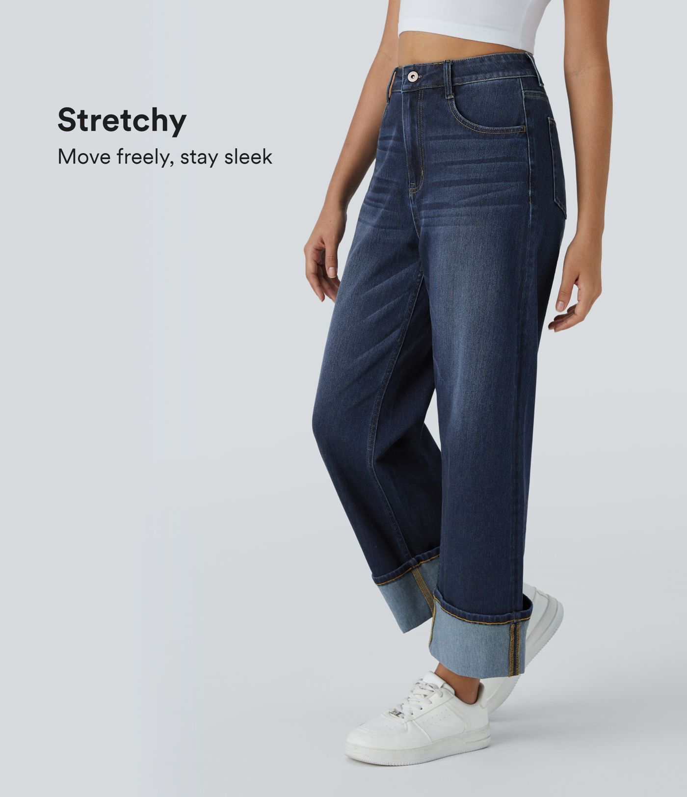 Halara Flex™ High Waisted Pockets Rolled Hem Wide Leg Washed Casual Jeans