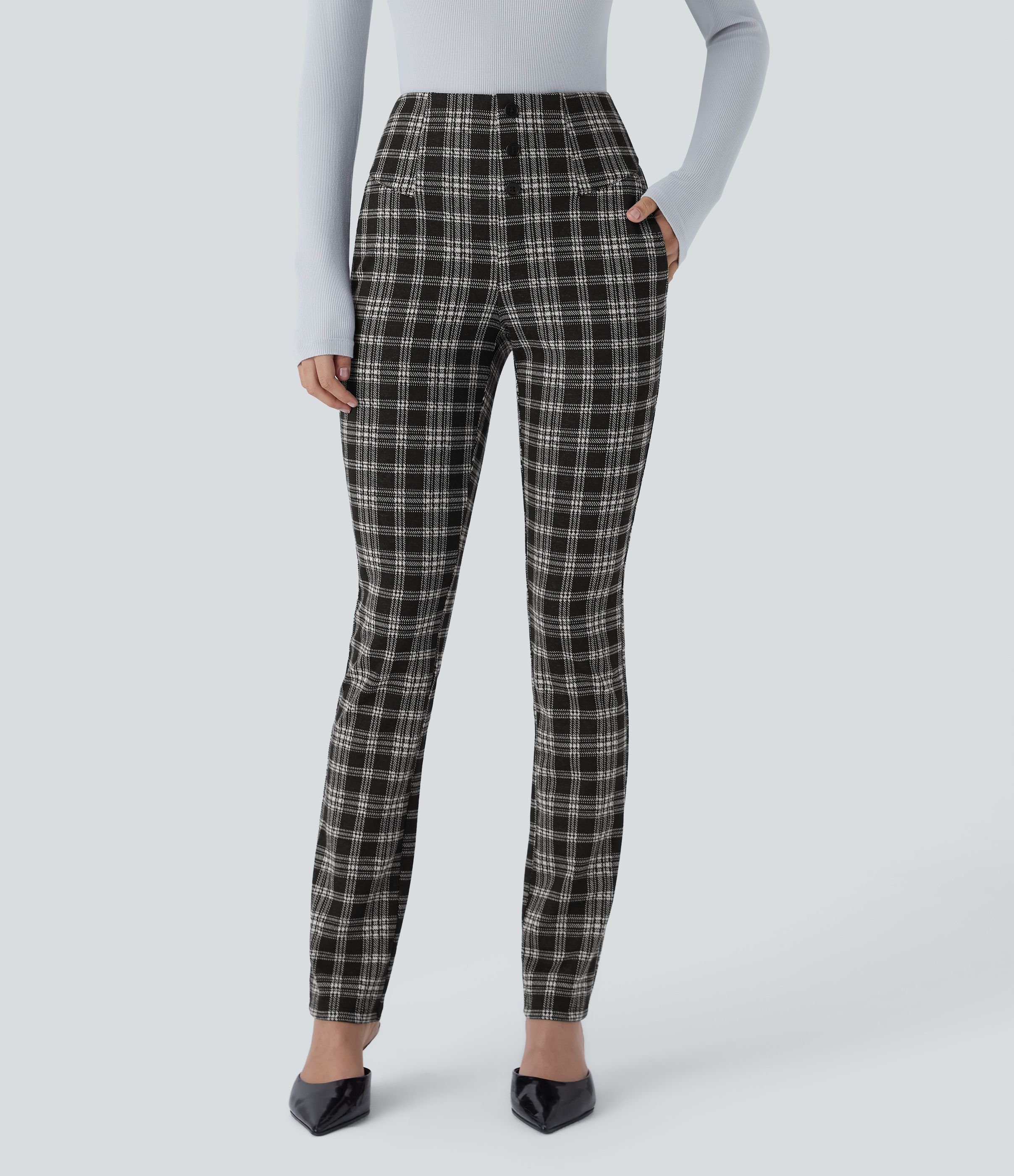High Waisted Decorative Button Side Pocket Houndstooth Plaid Skinny Work Trousers
